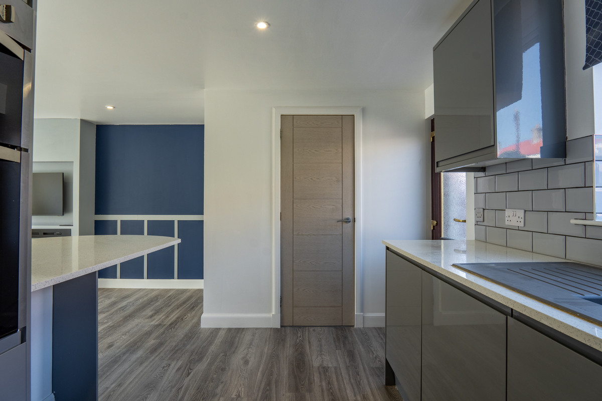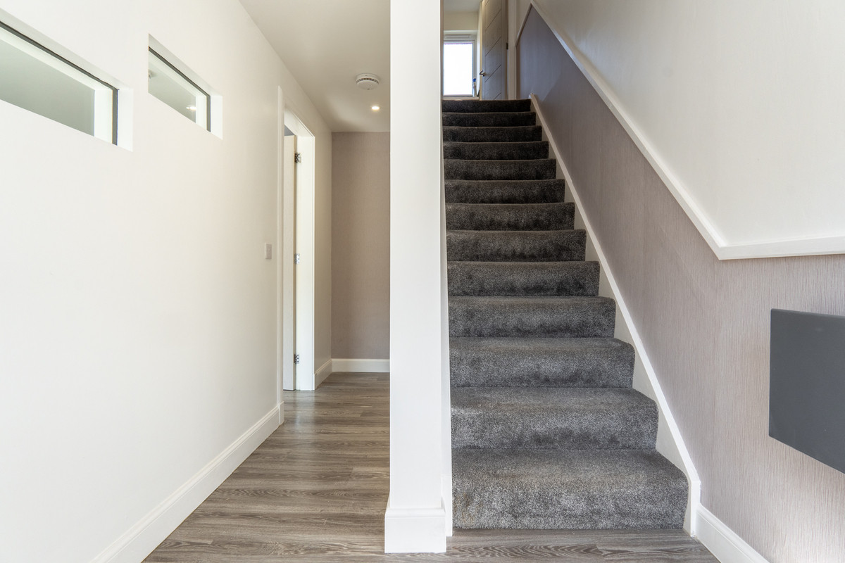 You enter the home into a bright hallway with white walls, grey wood laminate flooring and ceiling spotlights overhead. The same flooring continues seamlessly into the main living area, creating a sense of flow and cohesion throughout the ground floor.