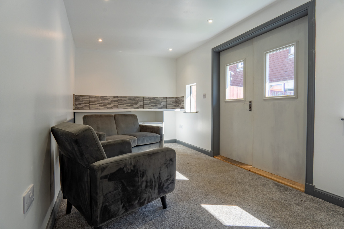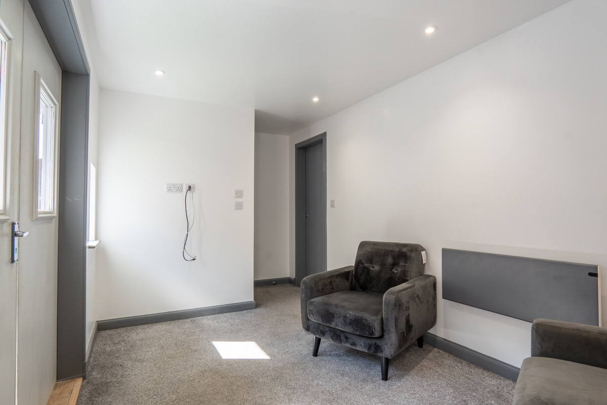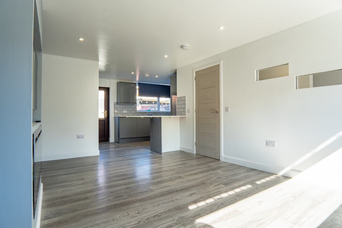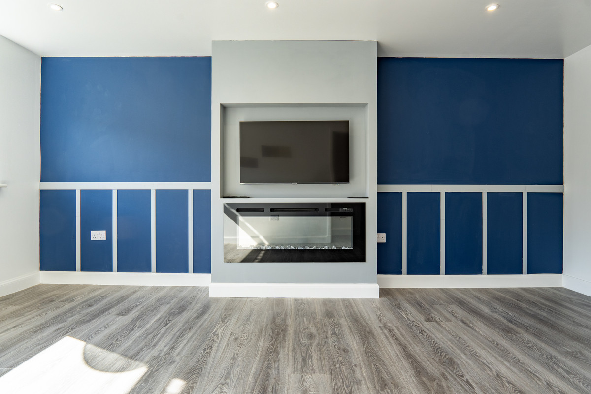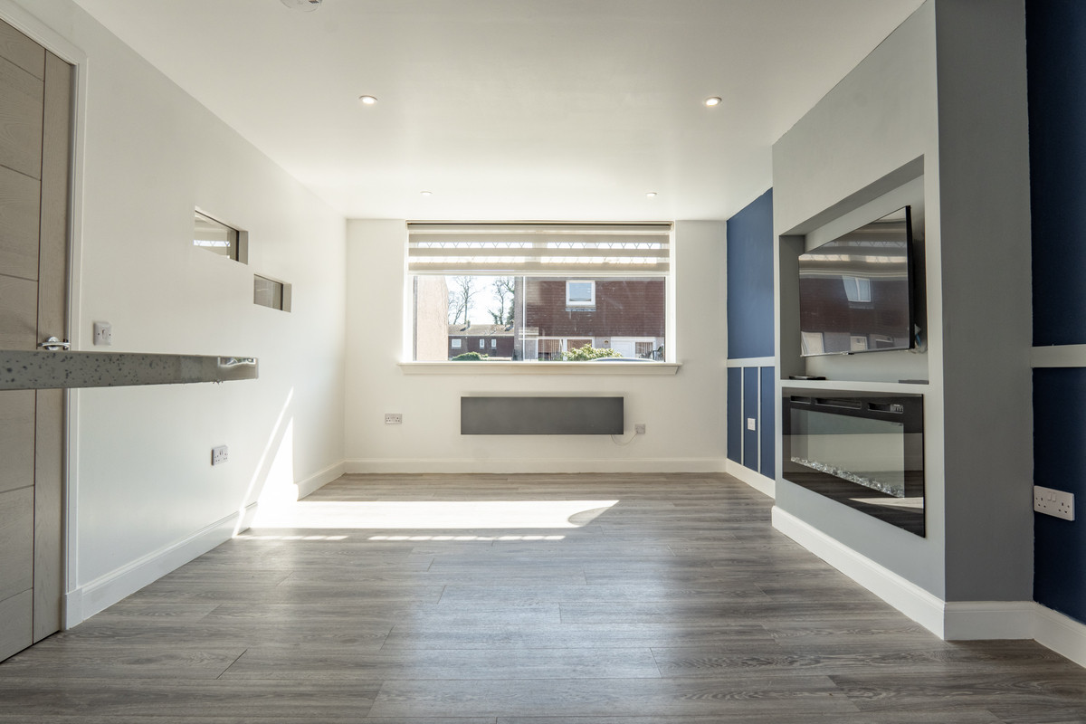 The open plan living, dining and kitchen space is the heart of the home. A large window at the front brings in natural light, with a wall-mounted heater beneath. Along one wall, painted in a rich blue, a mock chimney breast houses a long black electric fire, with a TV inset neatly above, providing both warmth and a focal point. The rooms generous proportions comfortably accommodate sofas and furniture, while the open layout creates an easy, social atmosphere.