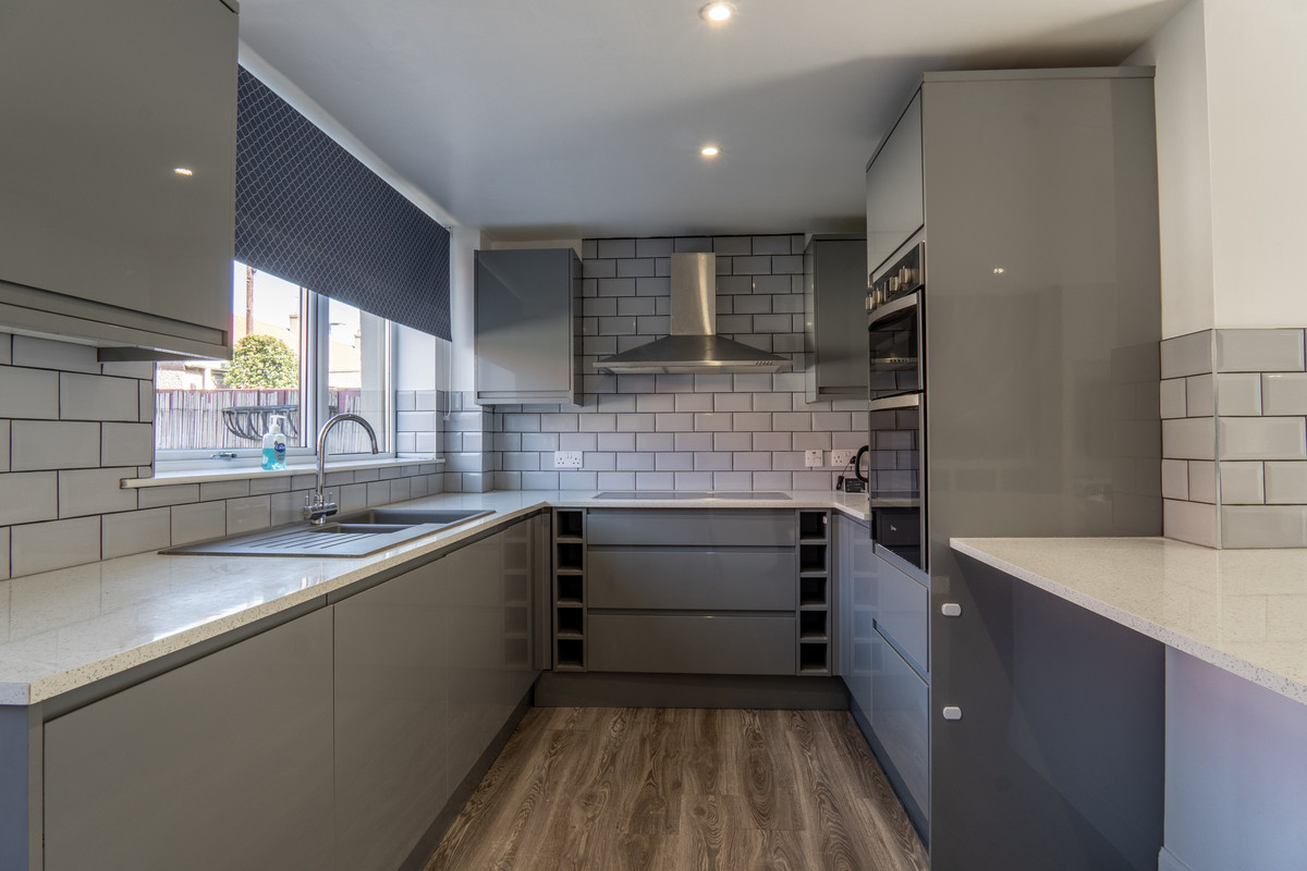 The kitchen area is fitted with sleek, dark grey units and chrome integrated appliances, including a built-in oven and hob with extractor hood. White worktops add contrast and brightness, while light grey tiling with black grout brings a bold, modern finish. The sink sits beneath a window looking out to the rear and the worktop extends to form a breakfast bar that separates the living and kitchen space while offering a spot to dine or work casually.
