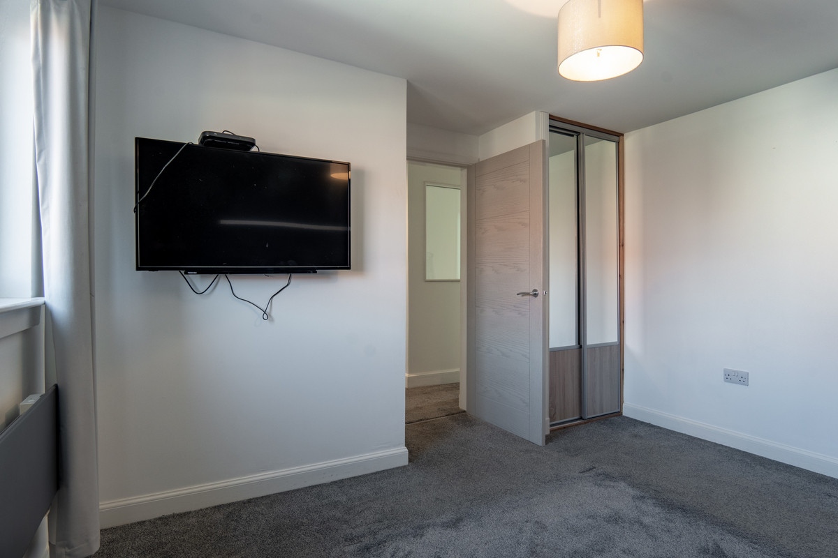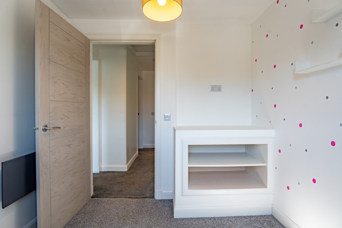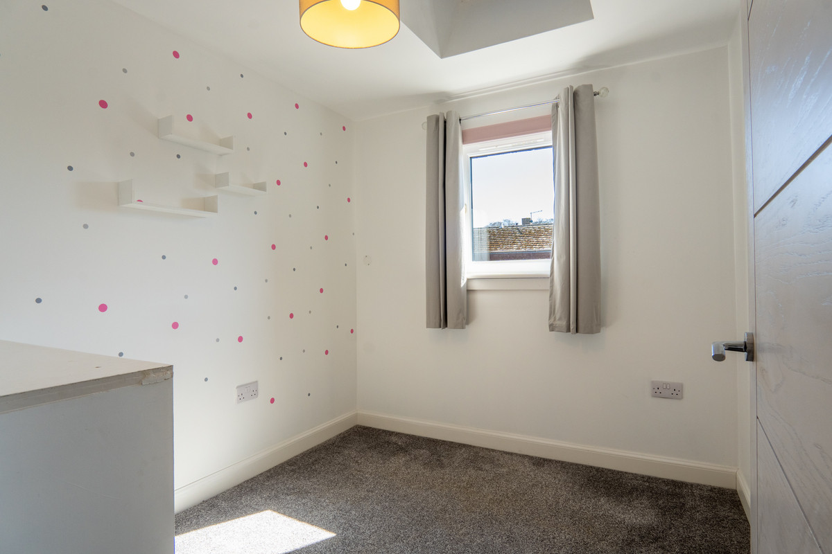 The third bedroom is a bright single, with white walls and a feature wall decorated with colourful dots in soft pink, blue and green tones. It’s a cheerful, well-proportioned room with a window and thick grey carpet, ideal for a child’s room, guest space or study.