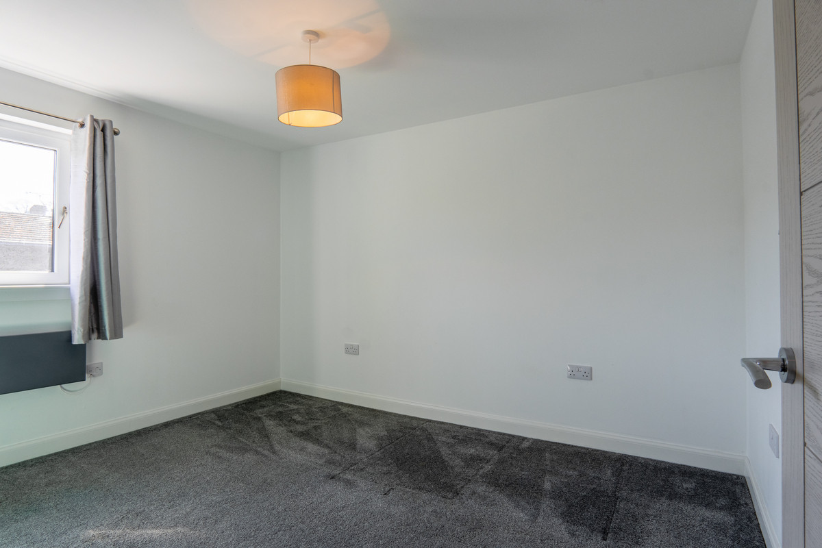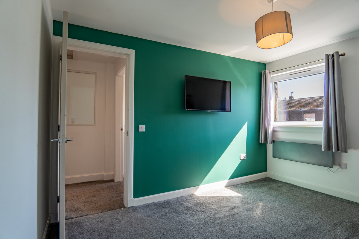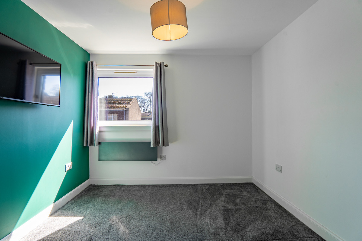 The second bedroom is another double, featuring a rich green accent wall and a window for natural light. There’s space here for a double bed and furniture, with the same soft grey carpet underfoot and a clean, simple finish throughout.