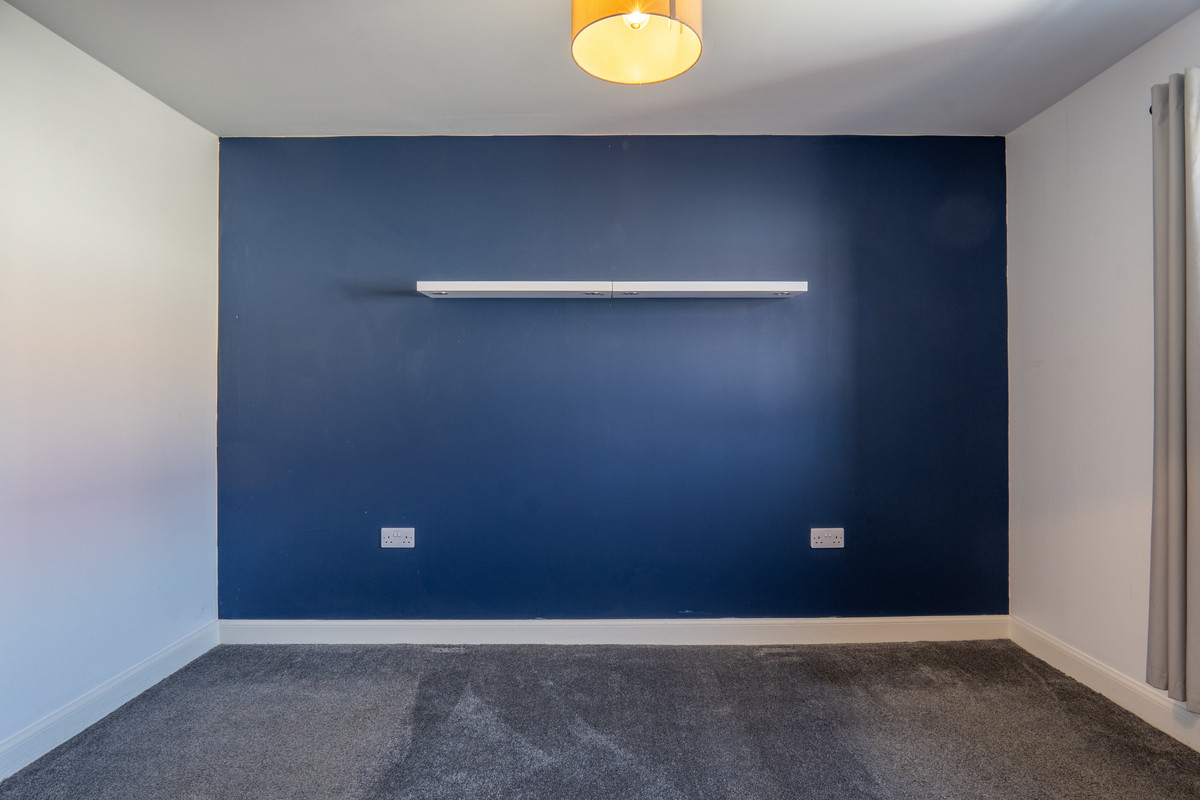 The staircase is laid with a thick, dark grey carpet, which continues onto the landing and into each of the bedrooms upstairs. The main bedroom is a spacious double, with a bold deep blue feature wall with the remaining walls in white. A small built-in wardrobe with mirrored doors adds practical storage without taking up floor space. A window looks out to the front with a heater positioned beneath.