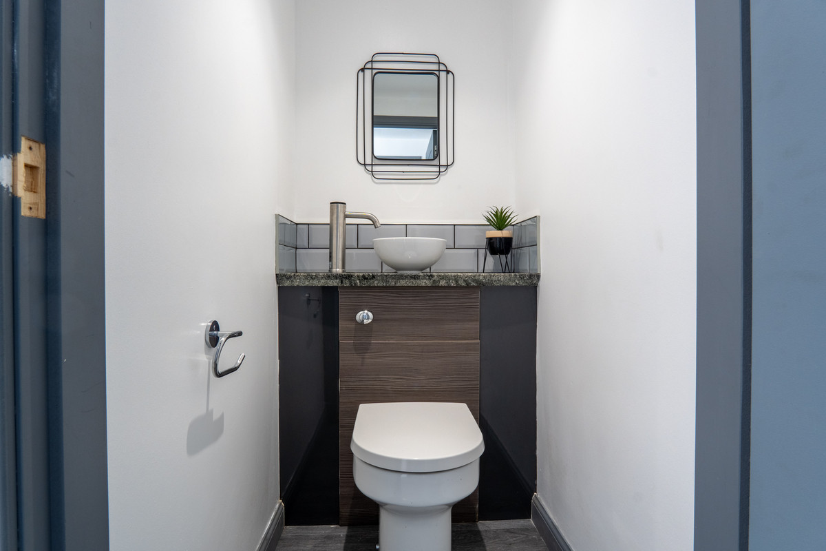 To the rear of the home is one of its most exciting features – a fully lined timber summer house. Finished with double glazed windows and fitted with power, light, a panel heater and even its own toilet and wash hand basin, it’s a brilliant, flexible addition to the home. With white walls, spotlights and a carpeted floor, it’s ready to be used as a home office, garden bar, creative studio or even occasional guest space.