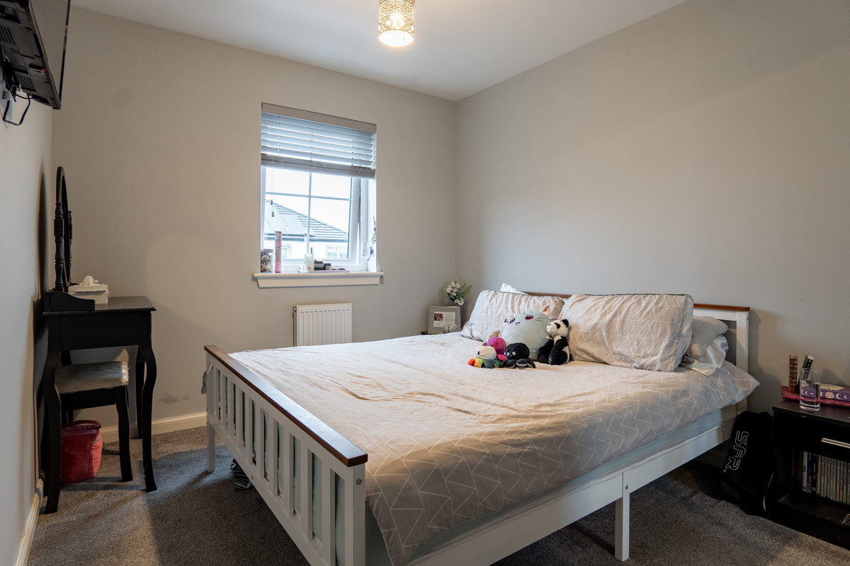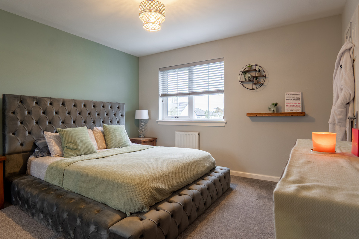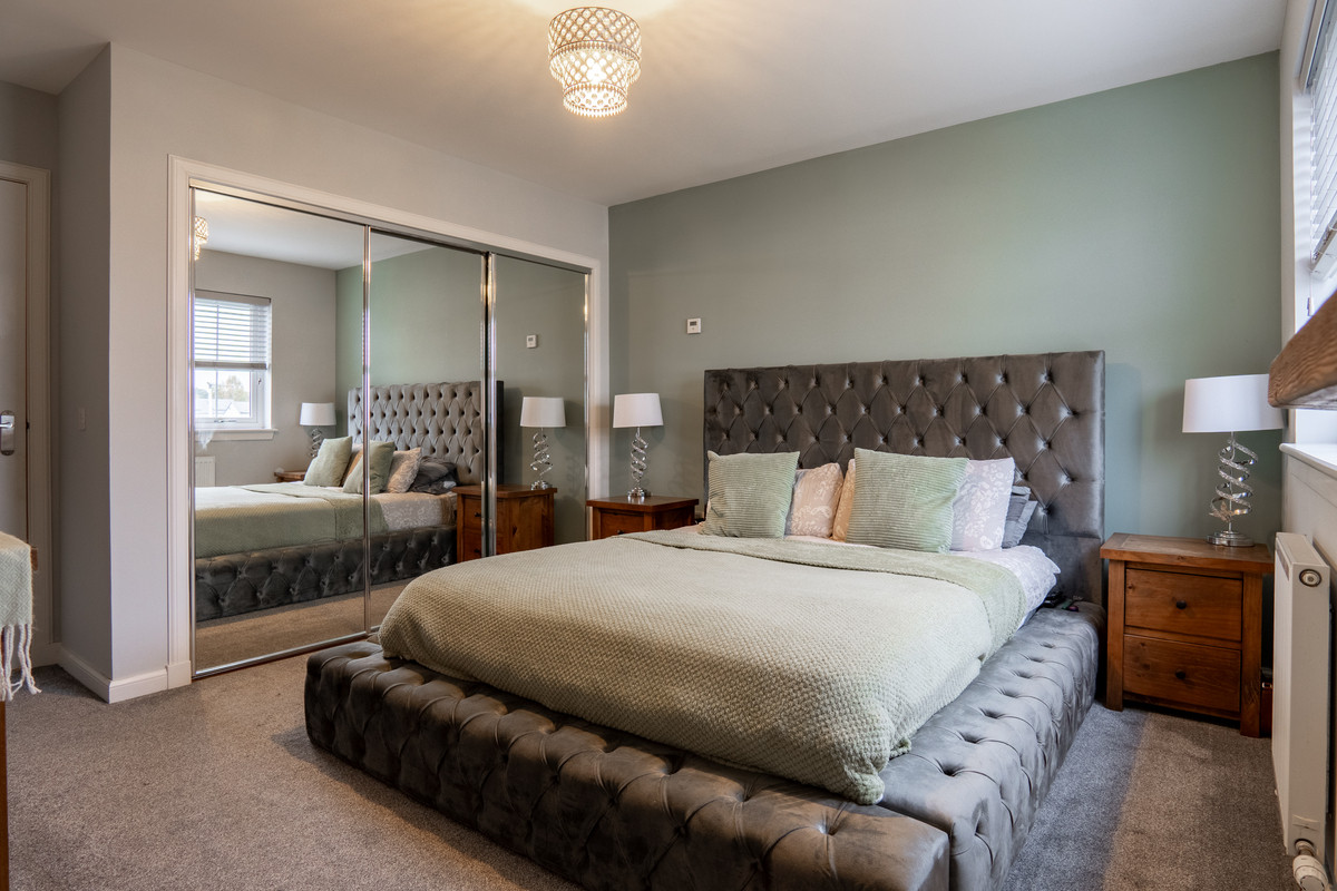 A soft grey carpeted staircase leads to the first floor, where the home’s four bedrooms and bathroom are found. The main bedroom is a beautifully presented space. A soft grey carpet complements the light green feature wall, creating a subtle yet elegant contrast. A large window fills the room with natural light, and mirrored fitted wardrobes along one wall provide generous storage. There’s room for a king size bed and additional furniture. The en-suite shower room continues the same high standard of finish. It features a walk-in shower enclosure with textured neutral toned tiles, a vanity unit with an integrated basin and concealed cistern toilet while a large illuminated mirror is mounted above. A chrome heated towel rail and patterned vinyl flooring complete the look, making this a contemporary and relaxing private retreat.