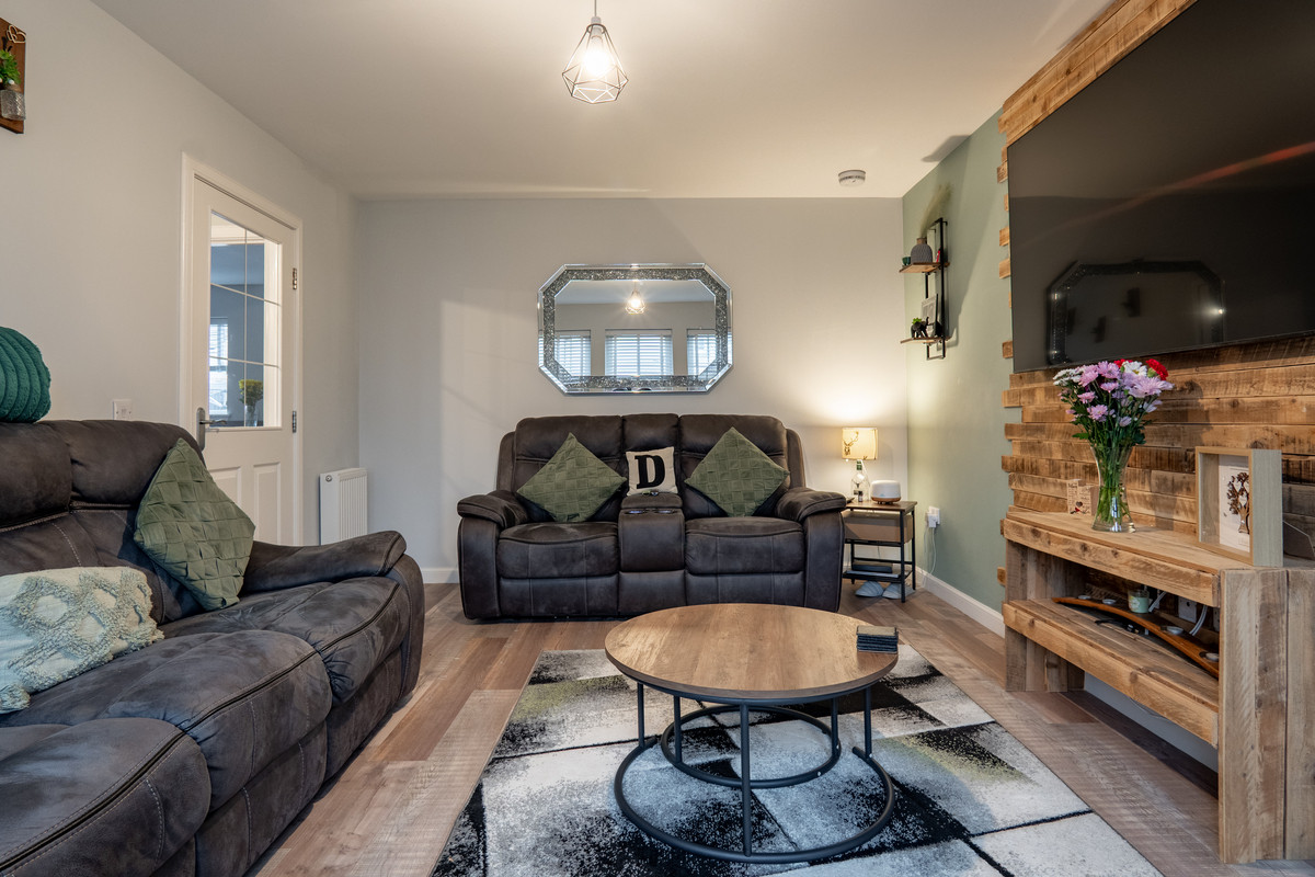 The living room is designed with both comfort and style in mind. Three walls are finished in a light grey shade, with one accent wall in soft green that adds warmth and depth to the room. This wall also features a striking timber clad section framing the television area, introducing a touch of rustic texture that complements the home’s modern decor. Three front facing windows allow natural light to pour in, while wooden flooring ties the space together beautifully. The layout comfortably accommodates two large sofas, with modern pendant lighting and minimalist shelving adding the final touches to this relaxed, family-friendly room.