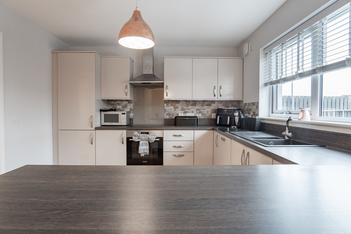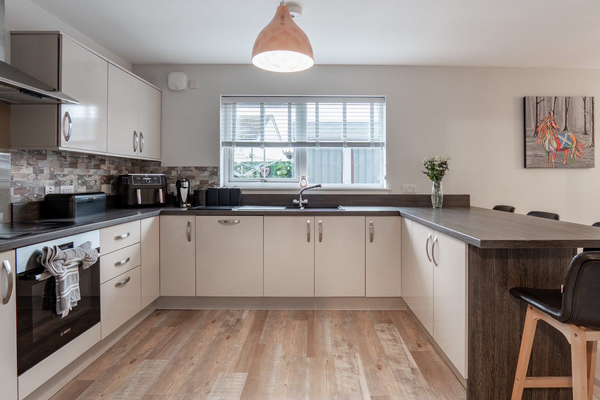 Inside the open plan kitchen and dining space forms the hub of this home. It’s a bright, stylish area featuring modern cabinets in light neutral tones, complemented by dark worktops and a textured tiled splashback that adds depth and character. The kitchen includes a modern electric oven with hob above and a stainless steel extractor hood over. A breakfast bar divides the room, offering a casual spot for family breakfasts or catching up over coffee, while still maintaining an open layout. Beyond the kitchen, the dining area provides space for a full sized table and chairs, making it ideal for family meals or dinner with friends. French doors open directly onto the rear garden, allowing natural light to pour in.