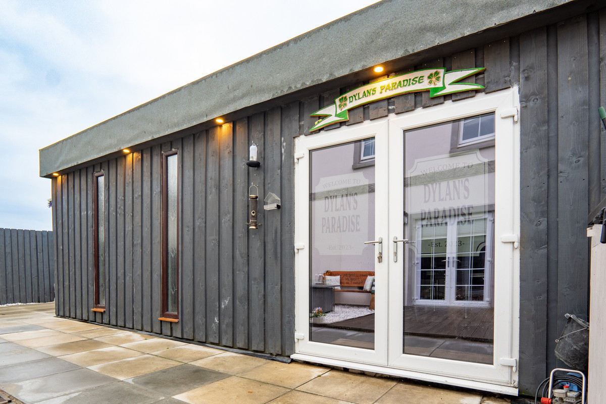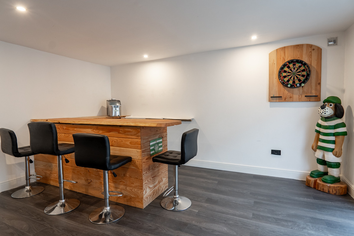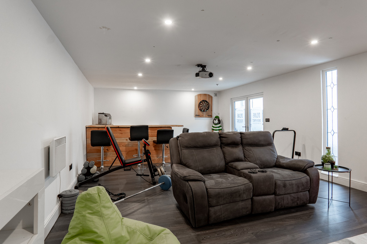The rear garden has been designed for easy upkeep and year round use. It’s fully enclosed by timber fencing and combines decking, paving and decorative stone for a clean, modern look. There’s plenty of room for outdoor seating and dining, with distinct areas for relaxing or entertaining. In the garden sits a substantial garden room, timber framed and clad, with a flat felt roof and downlighting along the exterior. Extending to around 33 square metres inside, it’s currently used as a home cinema and bar but offers real versatility for hobbies, exercise or working from home. Overall, the outdoor space strikes a great balance between practical living and a sociable setting for family life.