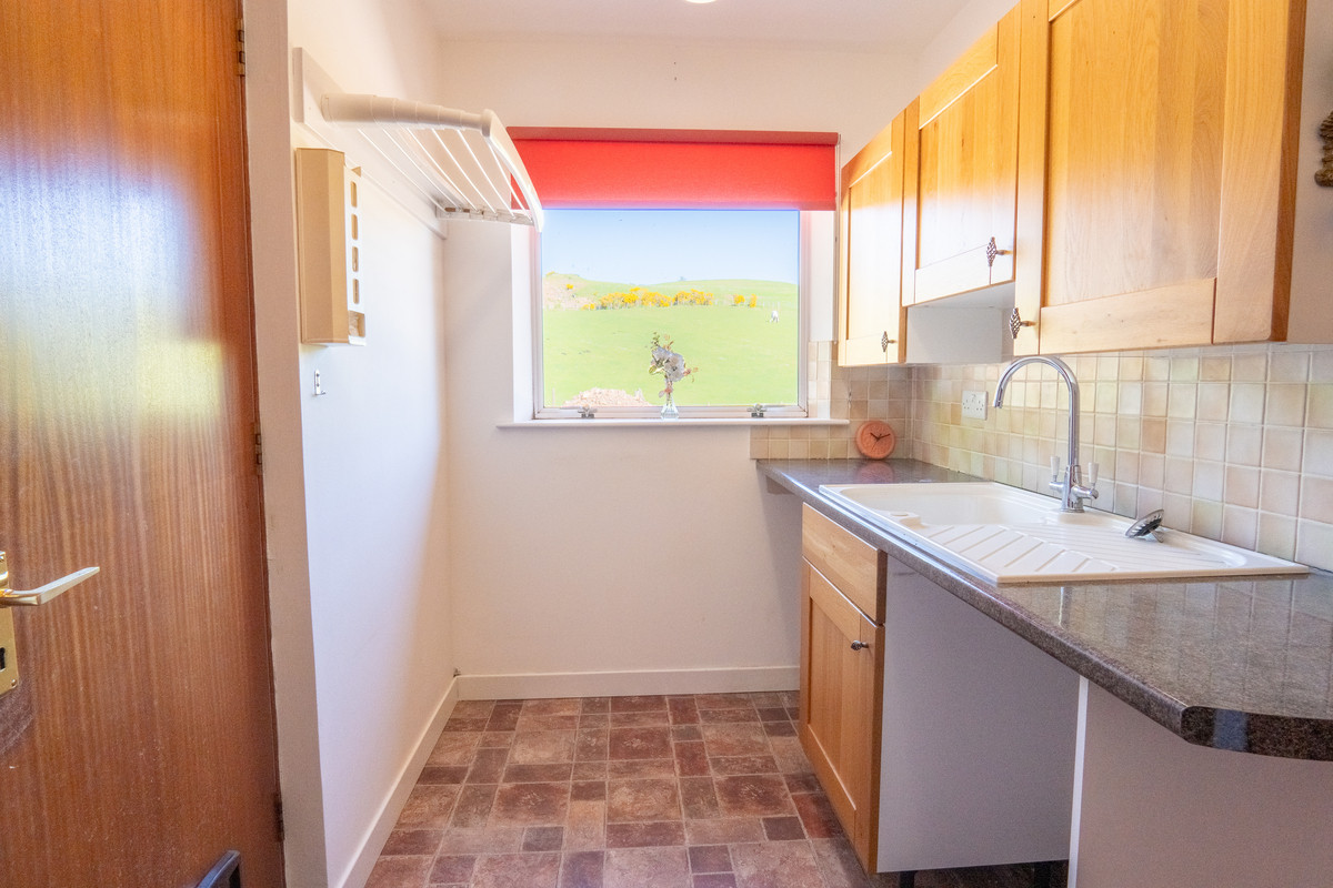Off the kitchen, the utility room features additional storage with wood-fronted units, a matching grey worktop and a sink. A wall-mounted drying rack makes this space highly functional for laundry and storage.