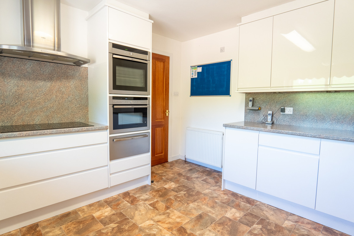 The kitchen features clean white units paired with grey acrylic worktops and matching splashbacks for a cohesive look. Integrated appliances include a built-in oven and electric hob with extractor above, and there’s space and plumbing for a washing machine. The sink sits below the window, bringing in natural light and keeping the space bright.