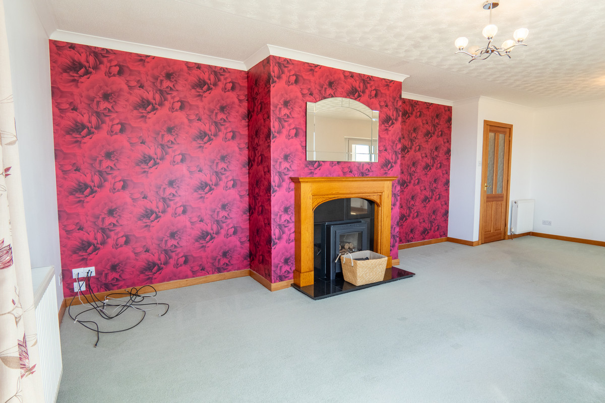 Access arrives at the rear of the home, with a tarred driveway, attached store, and metal-clad garage. Inside, the lounge is spacious and inviting, with a soft neutral carpet underfoot and white walls on three sides. A vibrant floral feature wall in pink and purple tones adds colour and character, while a timber fire surround with black inset and hearth creates a natural focal point for the fire that sits within. Multiple windows bring in light throughout the day and there’s ample space for sofas, shelving and display furniture.