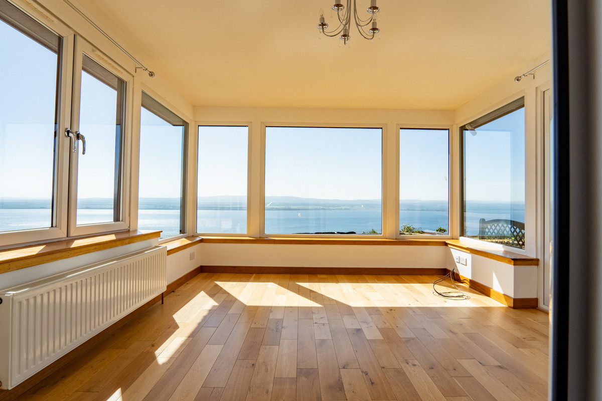 A glazed door leads from the lounge into the sun room. This is a beautifully bright space with windows on all sides, framing uninterrupted views of the sea and surrounding fields. Wood flooring adds warmth and character underfoot, while a wide radiator keeps the room comfortable year-round. A glazed door opens directly to the paved garden, making it an ideal spot for relaxing, reading or entertaining.