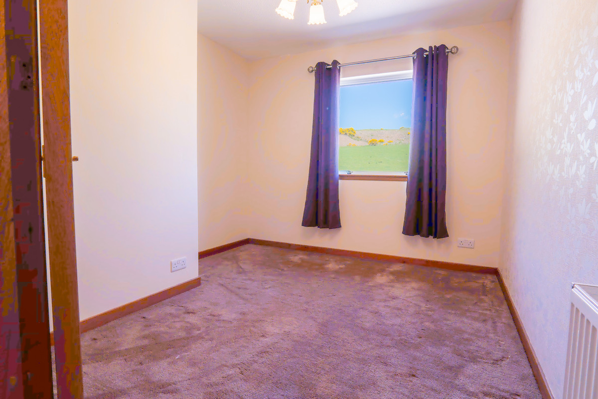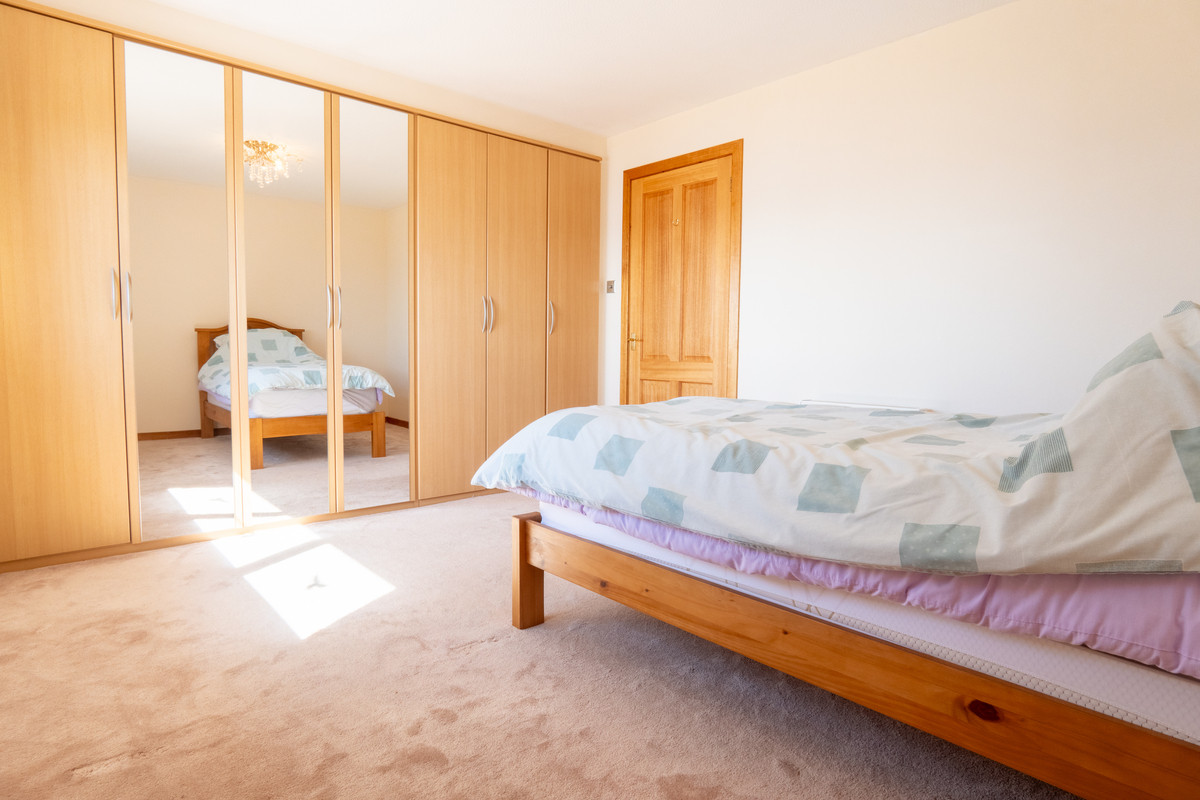 Another double bedroom includes a full wall-length built-in wardrobe with seven doors, three of which are mirrored to reflect light and add a sense of space. Soft carpet and neutral cream walls keep the look simple and easy to furnish. The third bedroom is a compact single, with cream walls, soft carpet and a window facing the countryside. A small radiator sits by the door.