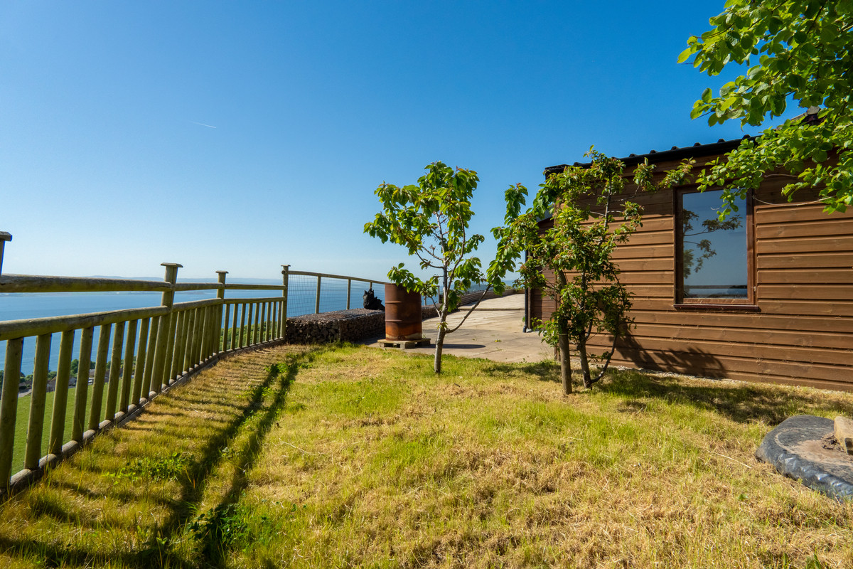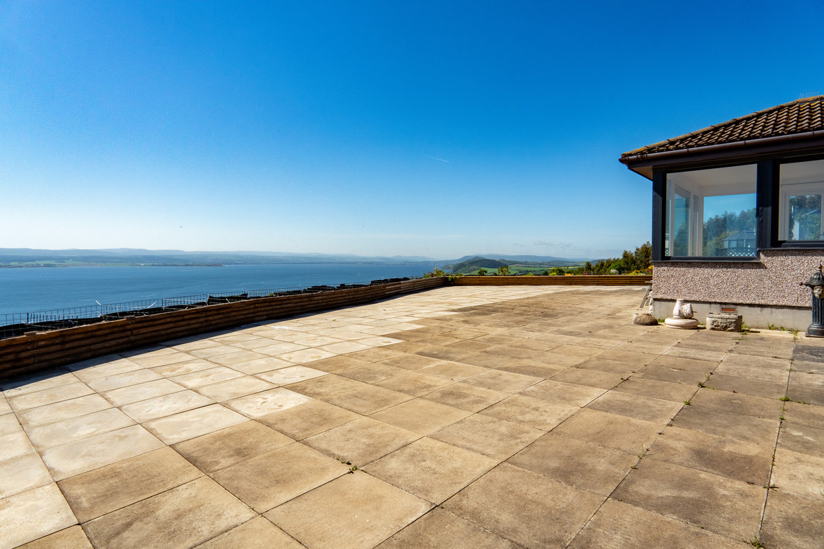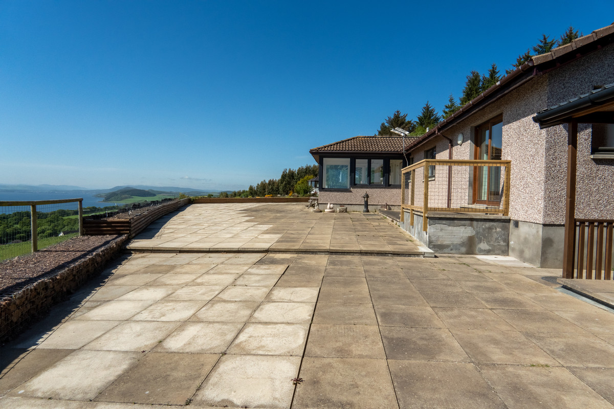 A wide paved patio stretches across the front of the property, perfectly positioned to take in the full sweep of sea and sky. The area has been carefully levelled using a gabion basket retaining wall, creating a solid and elevated platform that feels open yet private. Whether used for outdoor dining, morning coffee or simply sitting quietly to watch the weather roll across the Moray Firth, it’s a standout feature that connects the house directly to its surroundings.