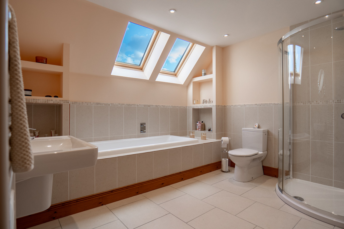 The attic levels form the main sleeping accommodation, beginning with a broad landing finished in soft grey carpet. From here, the family bathroom sets a luxurious standard. This is a large, light filled room, where a deep built-in bath sits within a tiled surround that cleverly incorporates recessed storage. A separate corner shower cubicle, fitted with a mains shower, adds everyday practicality. The floating basin, modern toilet and a heated towel radiator all combine with cream tiling, tiled flooring and ceiling spotlights to create a calm, contemporary space.