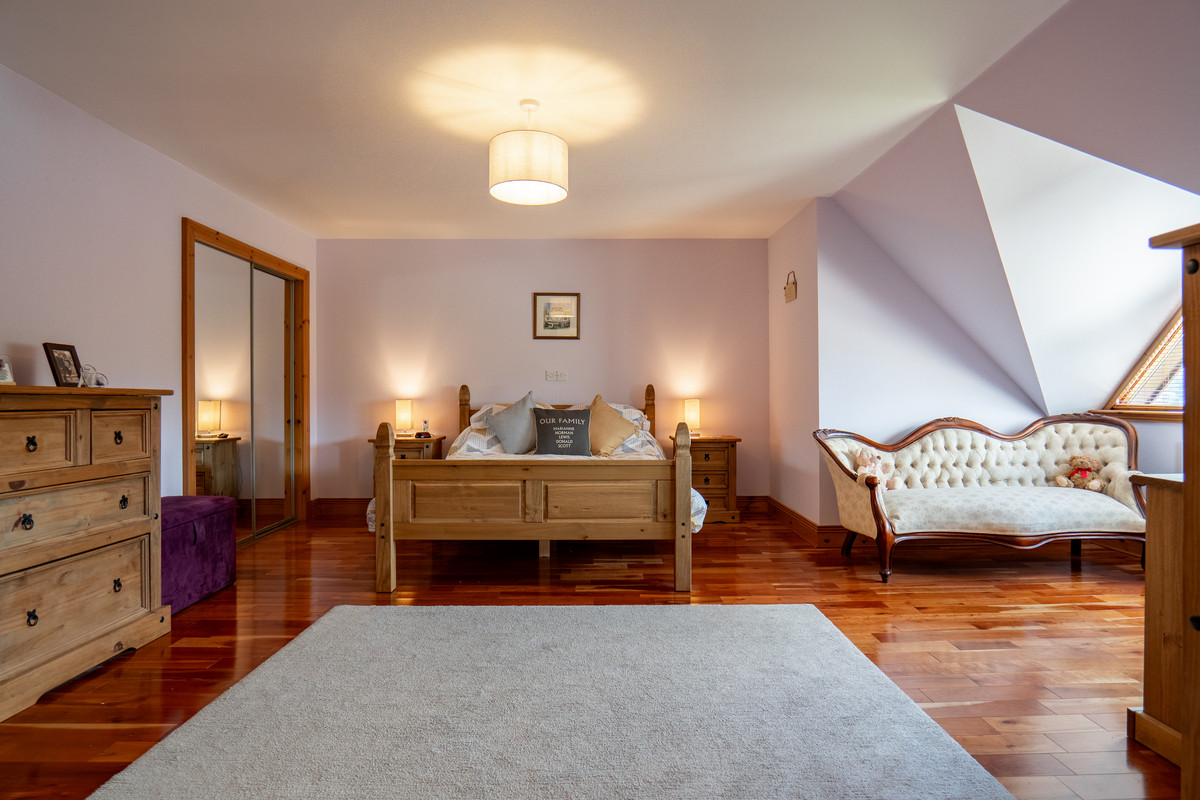 The master bedroom is exceptional in scale and finish. Rich wooden flooring underfoot sets a warm tone, while a dormer window projects out to the front, creating the perfect spot for a reading nook or a place to sit and enjoy the view. Two expansive double wardrobes with mirrored sliding doors offer excellent storage without compromising floor space. The en-suite shower room continues the luxurious feel, with tiled walls, a cubicle with mains shower and a white ladder radiator.