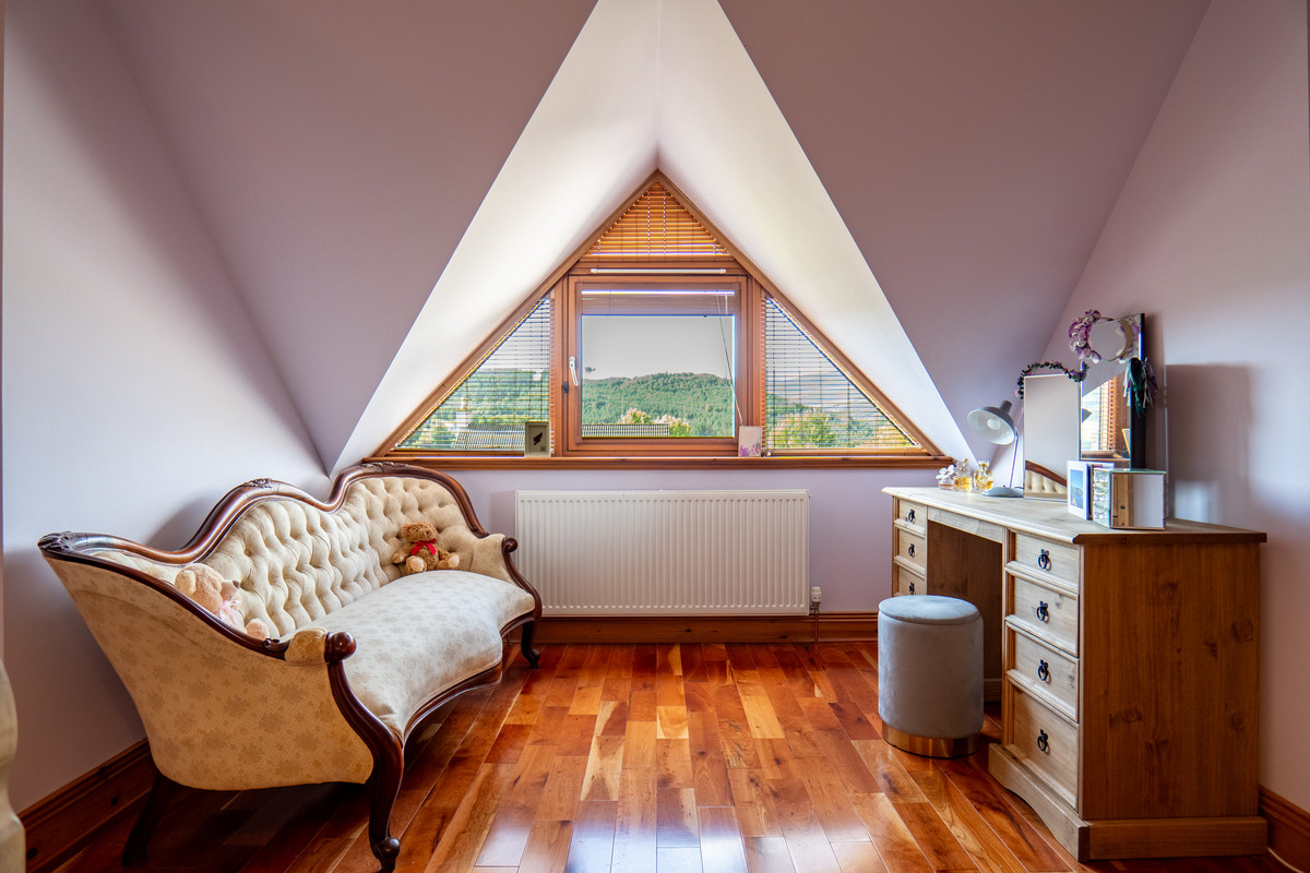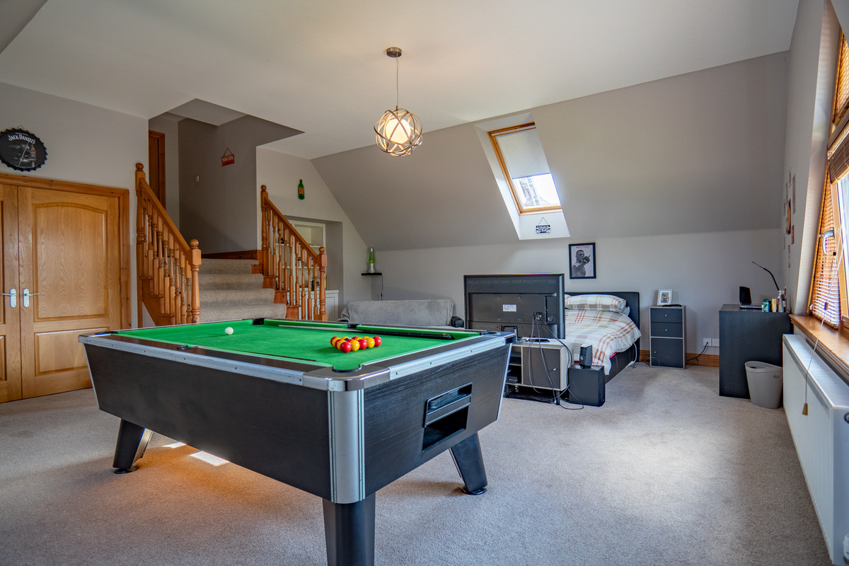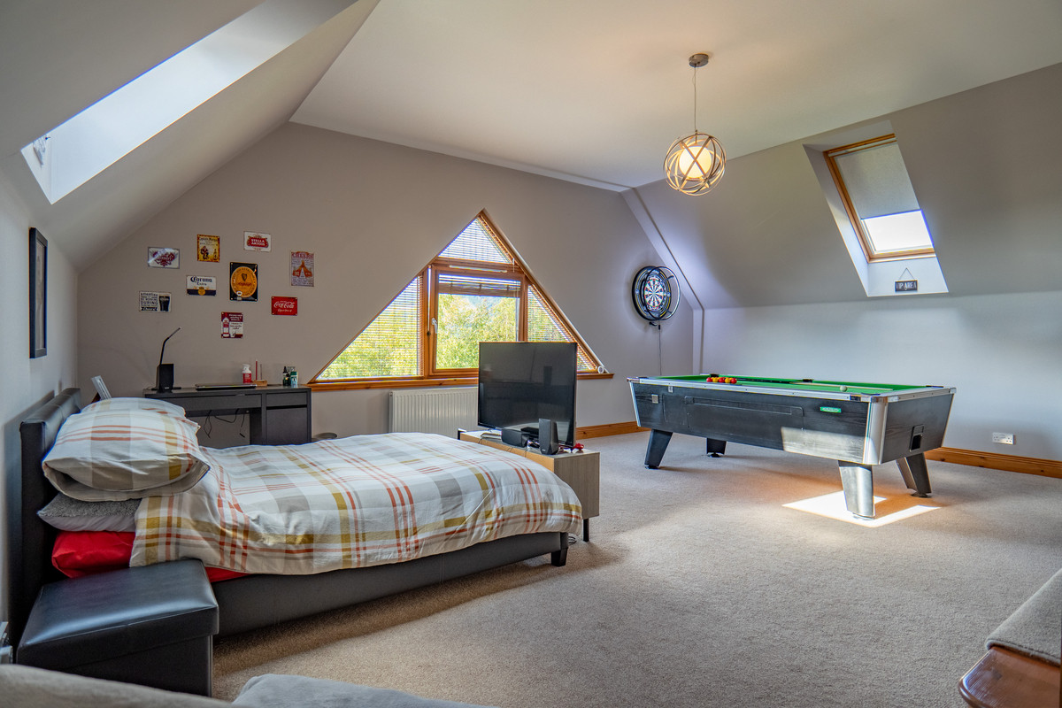 From the attic landing, a door opens to a short flight of steps that descends into the lower attic floor. Here lies another spectacular room, an expansive space with angled ceilings, rooflights and triangular windows that flood it with natural light. This vast space is hugely versatile. A built-in wardrobe offers useful storage, while the generous proportions mean the room can be used for a range of purposes, currently set up as a bedroom which also houses a pool table, darts board and television area. It could equally serve as a cinema room, studio, gym or additional lounge.