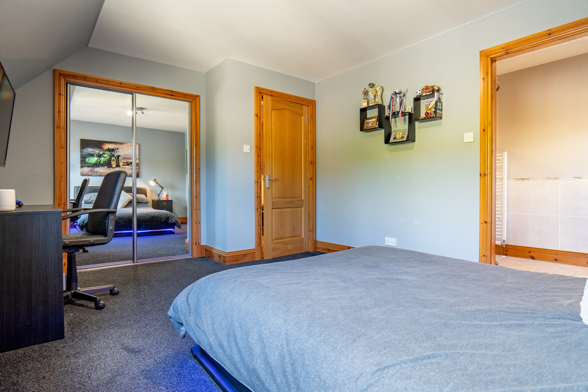 A second en-suite bedroom lies close by, this time finished with a soft grey carpet and a mirror fronted wardrobe. It’s a double room with its own en-suite. This private shower room features tiled walls, a mains shower, sink, toilet and towel radiator, blending style and practicality.