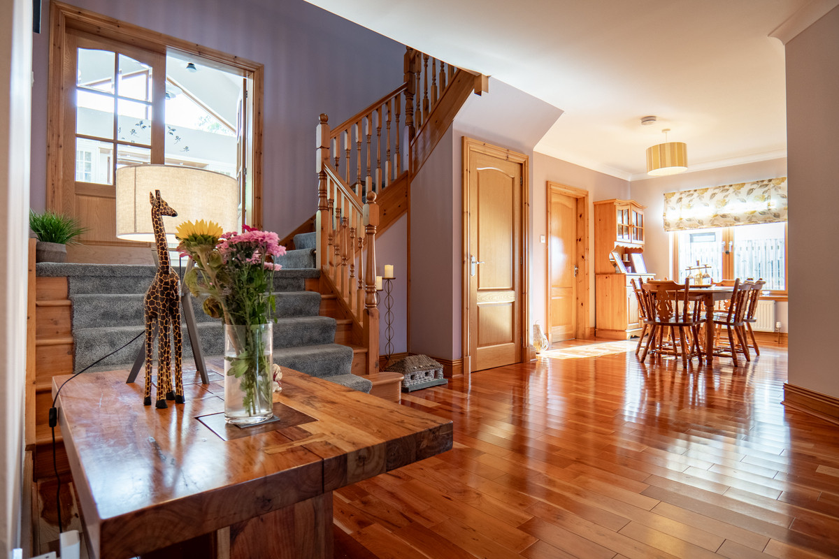 The entrance hall makes an immediate impression, finished with stunning wooden flooring that flows through the main level. This open space offers room for a dining table, set beside wide windows that draw in natural light, creating a welcoming heart to the home.