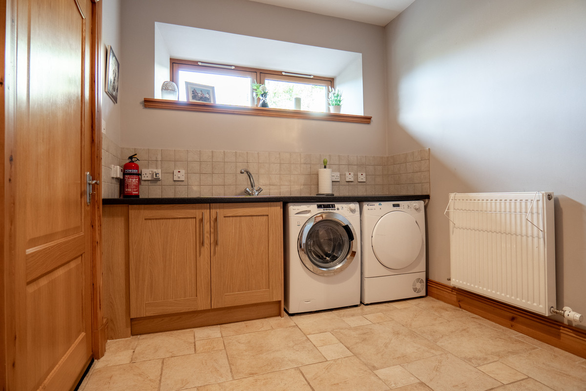 Stairs from the hallway descend to the lower ground floor, straight into the utility room. This is a practical space, fitted with additional counter and cupboards that extend the home’s storage. There is space beneath the worktop for laundry appliances.