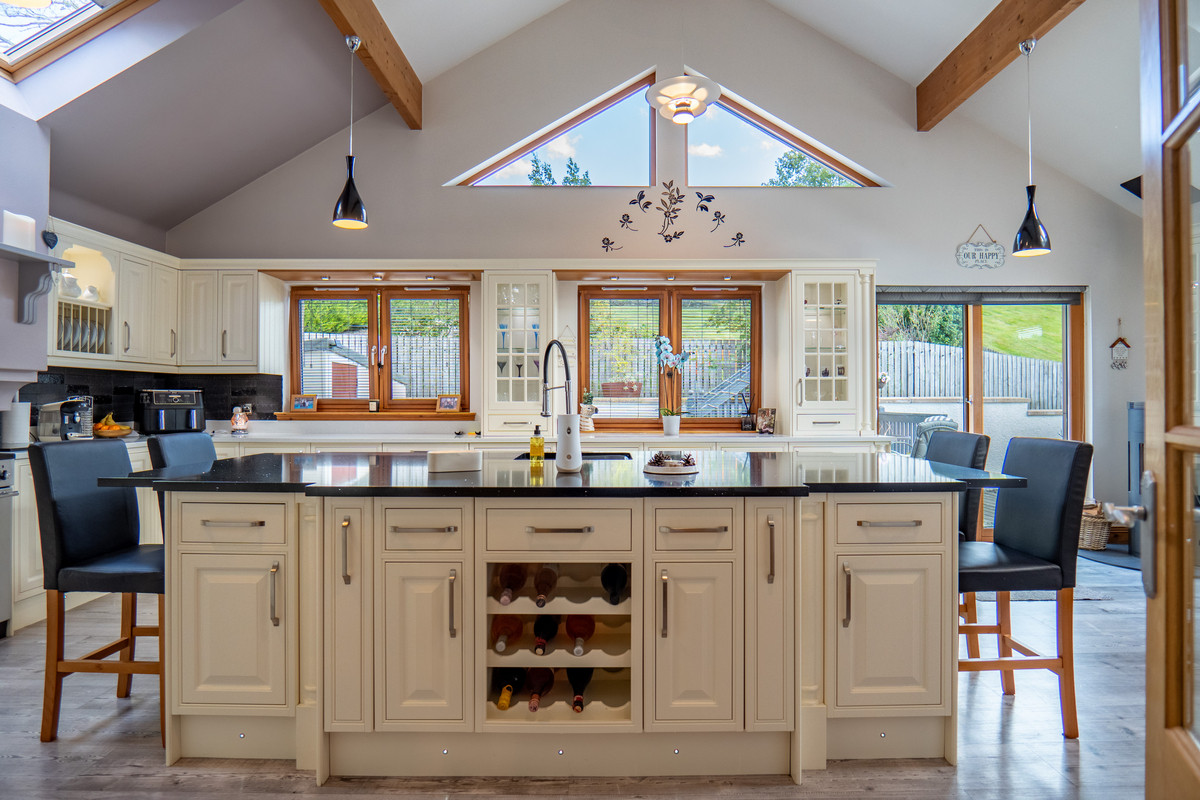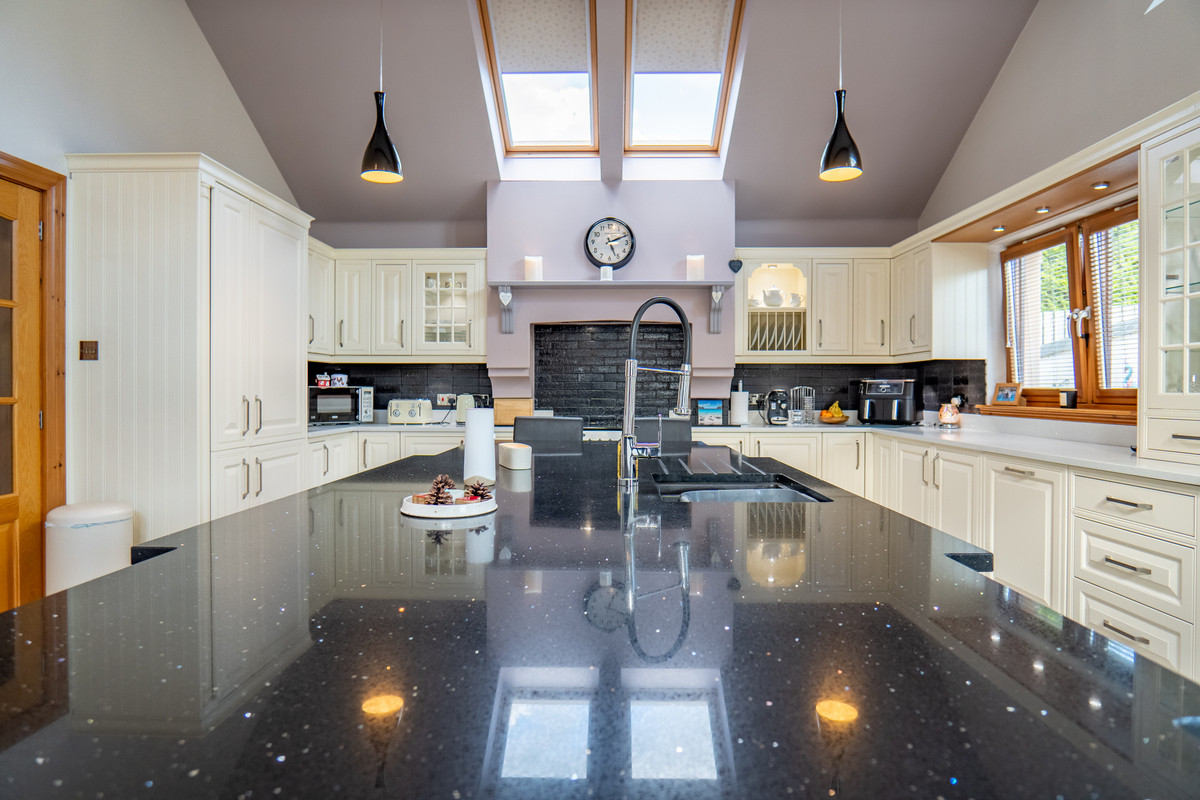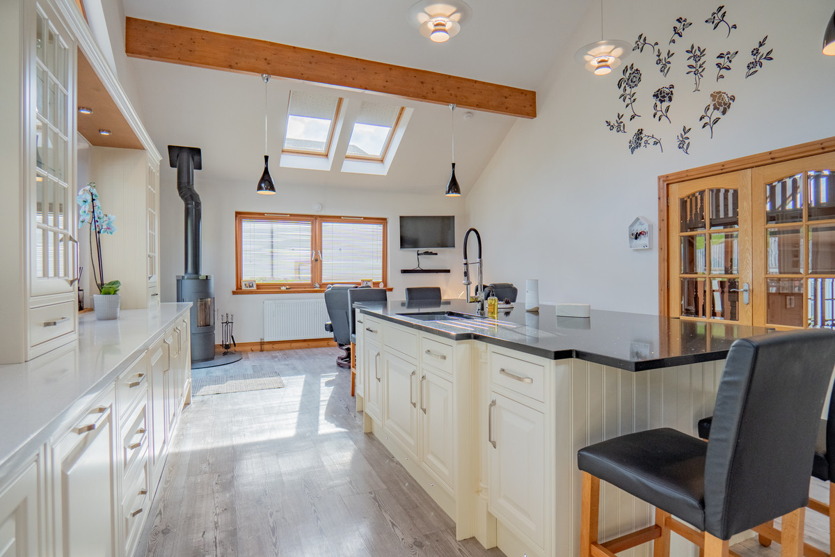 On the upper ground floor sits one of the property’s true highlights: the kitchen and dining area. This is a vast and beautifully designed room, fitted with a luxury Schrieber kitchen that immediately sets the tone. Quartz worktops run across light-coloured cabinets, offering both durability and style, while a striking central island sits at the heart of the room. The island incorporates the sink with a modern extender tap, additional storage and space for casual seating, making it a natural gathering point. A large range oven ensure the space is fully equipped for modern living, while the inclusion of glass fronted cabinets adds elegance as well as function. The room is large enough to comfortably accommodate a full family dining suite, and it is here that sliding doors open directly to the garden, allowing meals to flow naturally outdoors during warmer months. A multi-fuel stove set against one wall provides both warmth and a homely focal point, while large windows and rooflights draw in natural light from every angle. It is a room designed to be used throughout the day, from early breakfasts to evening entertaining and truly serves as the hub of the home.