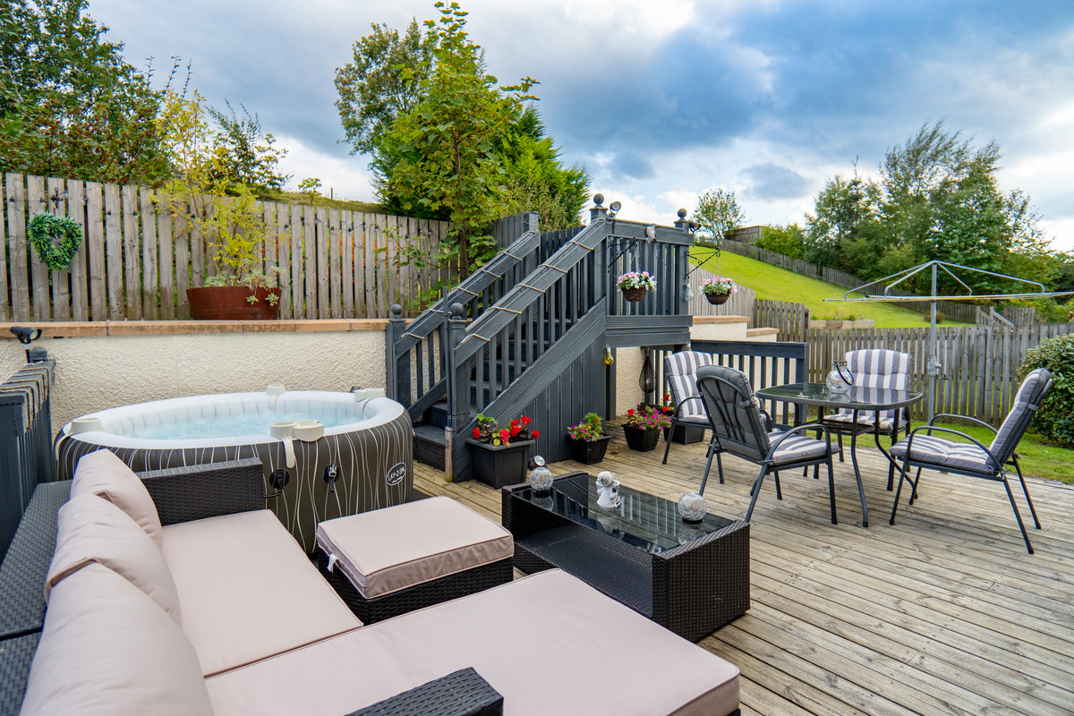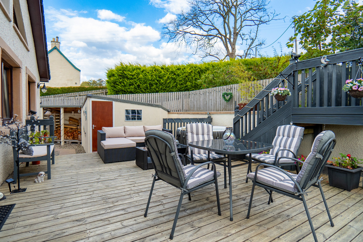 Outside, the property enjoys a commanding corner plot. To the front, a sweeping driveway offers ample parking alongside the integral garage. The rear garden is sloping and largely lawned, with paved pathways and a timber deck providing outdoor seating. A timber shed and wood store add practicality, while the elevated position enhances the sense of space and outlook.