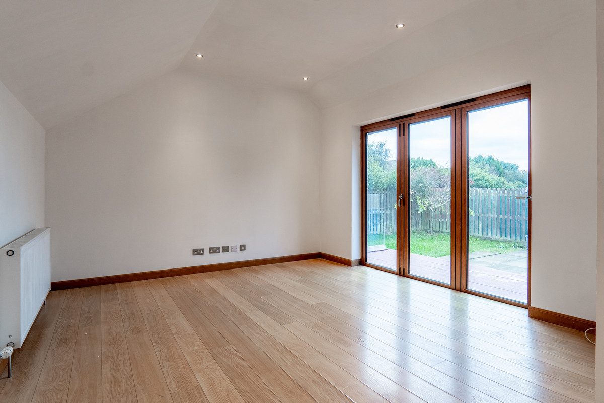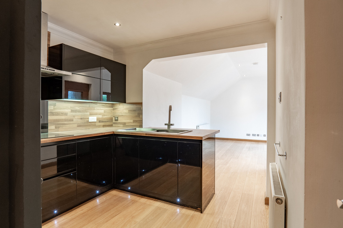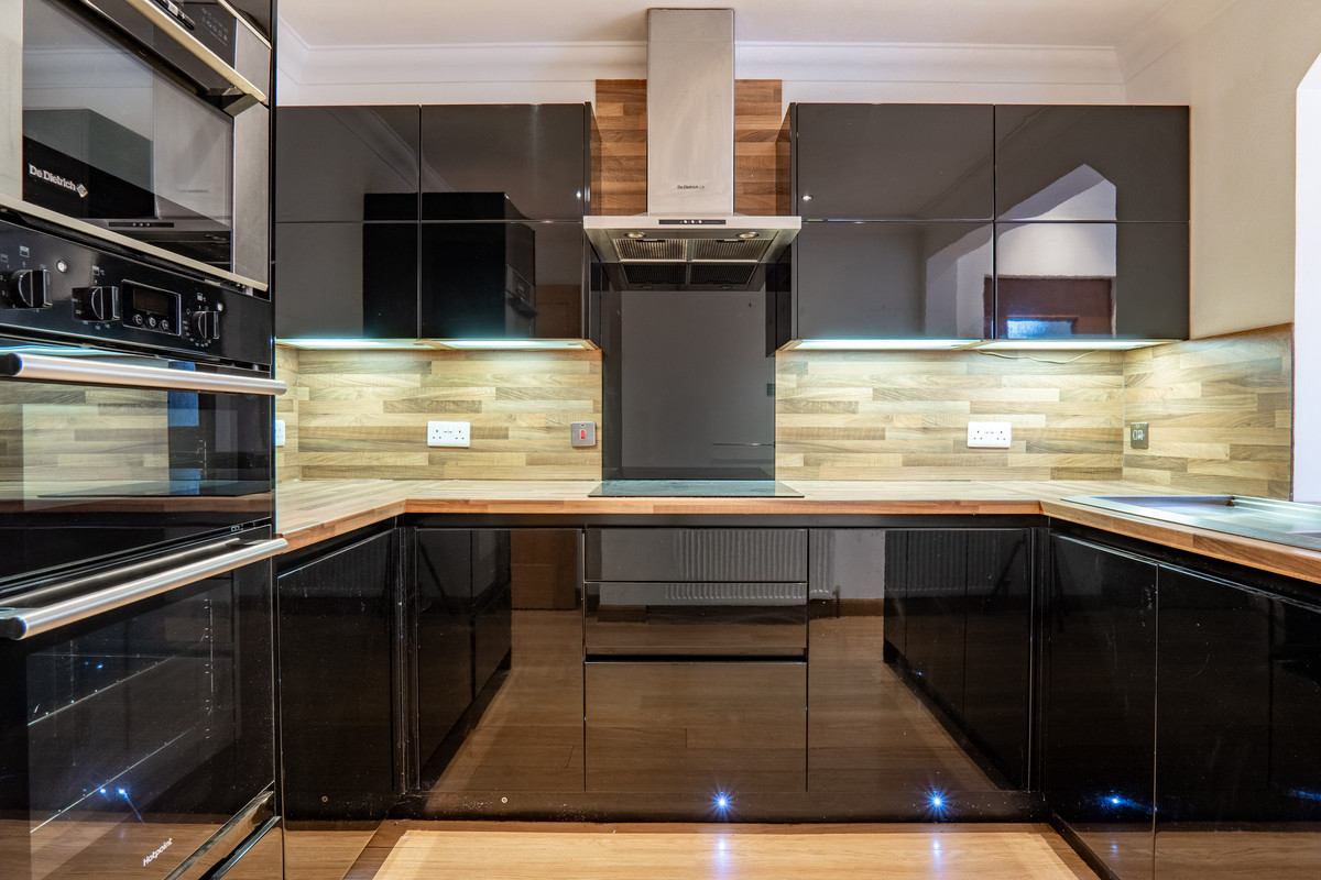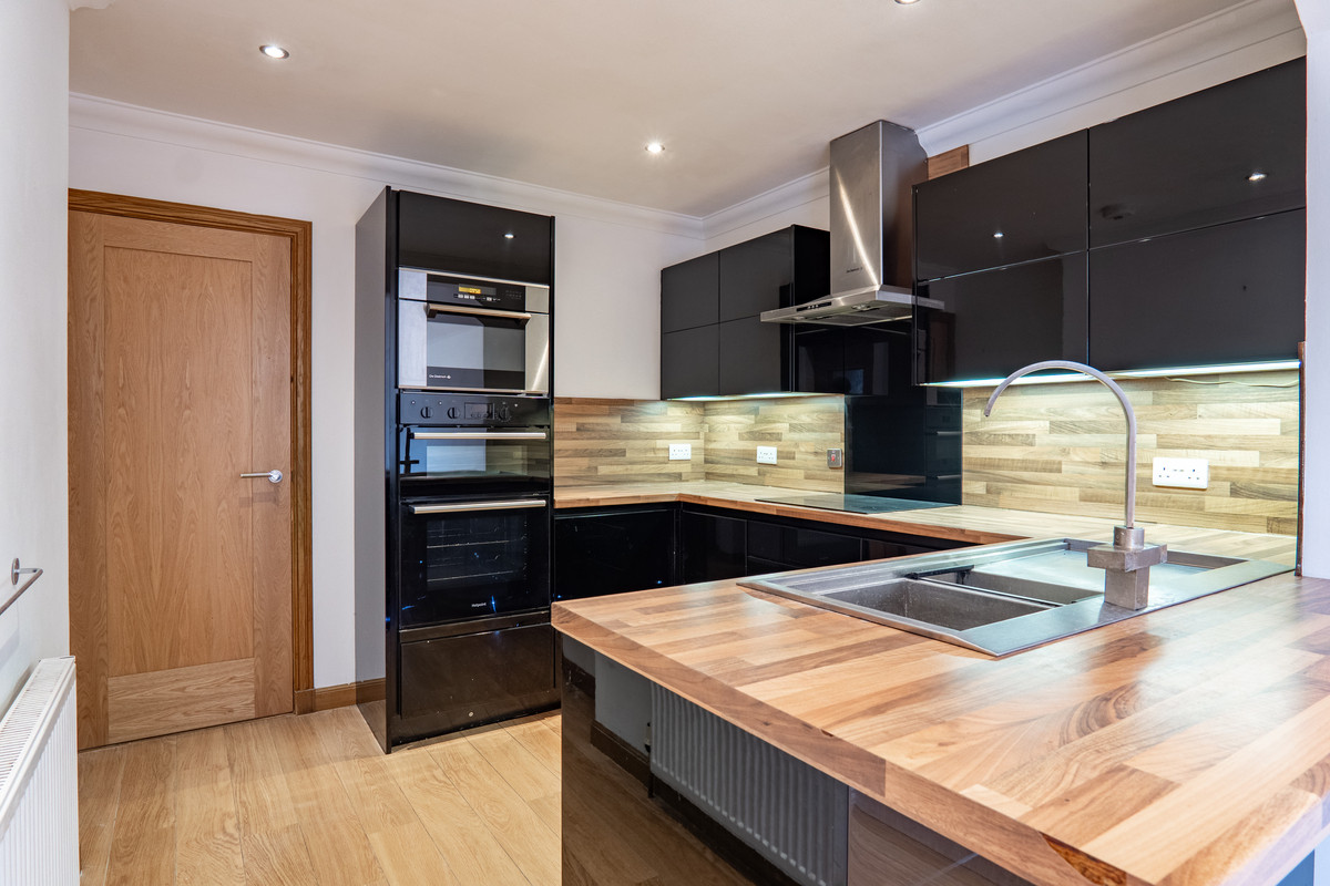 The open plan kitchen, dining and lounge area lies towards the rear of the property and forms a stylish heart to the home. French doors open directly onto the decking, creating a seamless link between indoors and out. The kitchen features sleek black high gloss cabinets paired with wooden worktops and matching splashbacks. Integrated appliances, including a built-in oven, microwave, hob and extractor, complete the modern setup. The adjoining dining and lounge space allows for flexible use, whether for family meals, entertaining or day to day living, with recessed ceiling spotlights adding a polished finish.