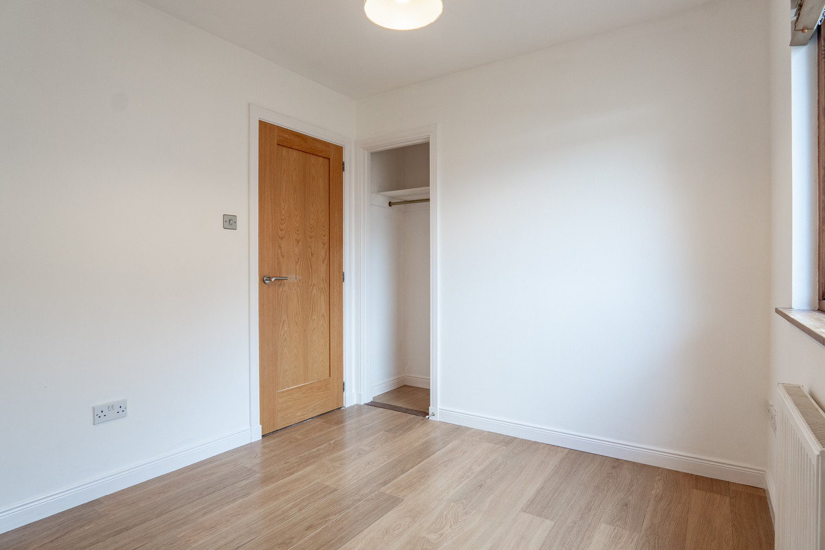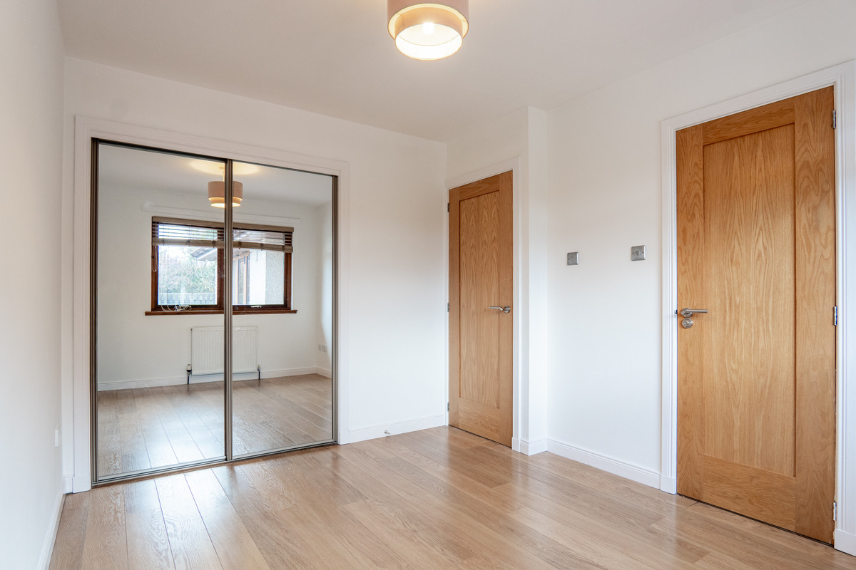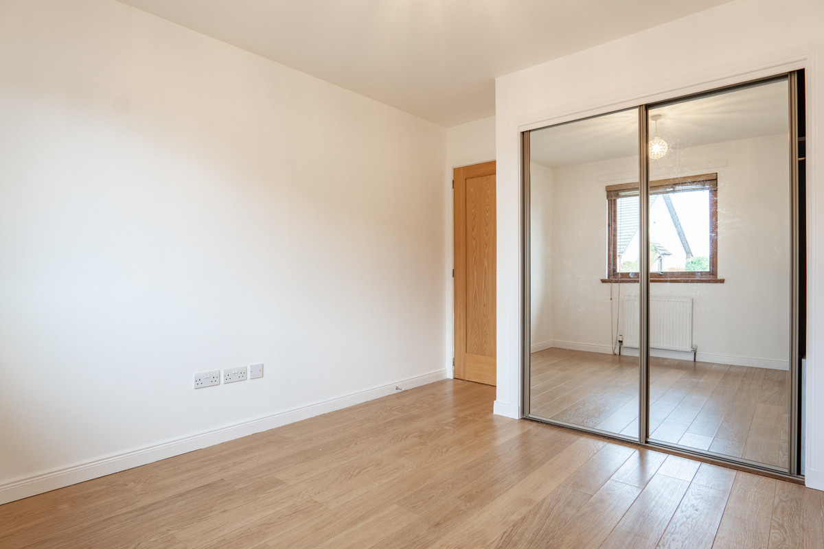 Bedroom two is a double and enjoys the same finish seen throughout the home. This room also has a built-in mirrored wardrobe, providing practical storage without interrupting the room’s simple, uncluttered style.