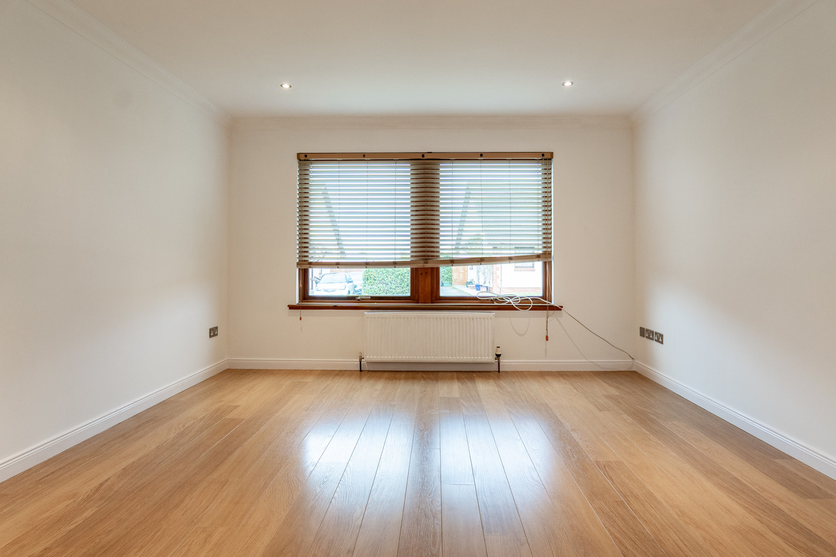 The living room sits to the front of the home and immediately feels bright and inviting. The space is finished in crisp white tones with wood flooring and matching skirtings that add warmth. A large picture window looks out to the front garden. The layout easily accommodates both a sofa suite and additional furnishings. With its clean, modern style and sizeable proportions, it offers the perfect place to relax or entertain.