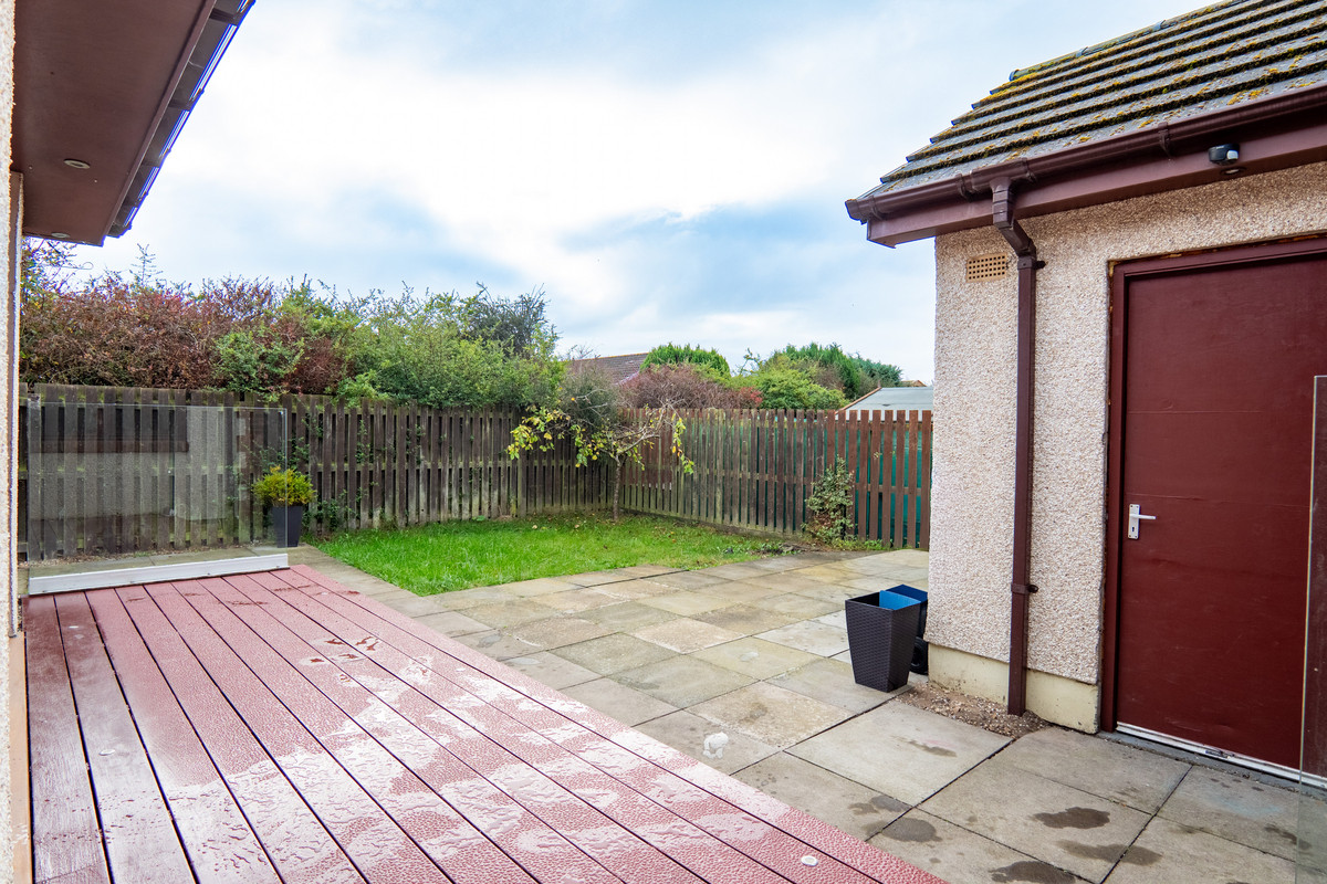 Outside, the rear garden is a private, low maintenance space that’s perfect for relaxing or entertaining. A timber deck sits directly off the doors from the living area, offering a spot for outdoor dining or morning coffee. The remainder of the garden combines paving and lawn, making it practical and easy to look after. Timber fencing encloses the space, ensuring both privacy and security, while the detached garage adds useful storage and workshop potential.