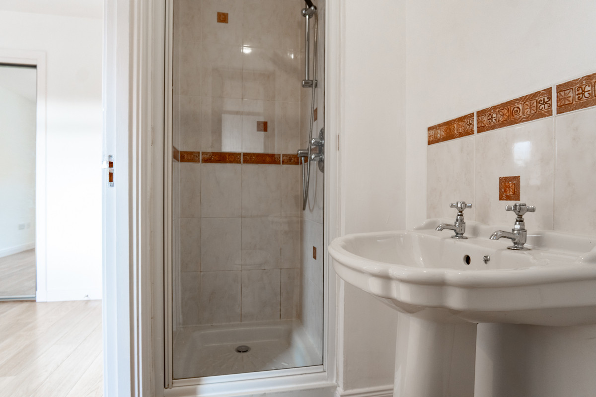The master bedroom is finished in soft, neutral tones with warm wooden flooring that ties in neatly with the rest of the home. Built-in mirrored wardrobes provide generous storage while helping the space feel open and uncluttered. The room comfortably fits a double bed with space for additional furniture. It also benefits from its own private en-suite which includes a shower cubicle, pedestal wash basin and toilet, with tiled walls and chrome fittings giving a simple, functional finish. It’s a handy addition that brings extra privacy and convenience to this part of the home.