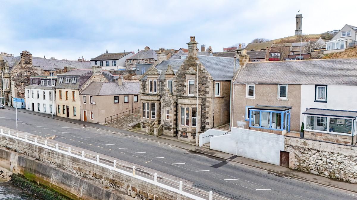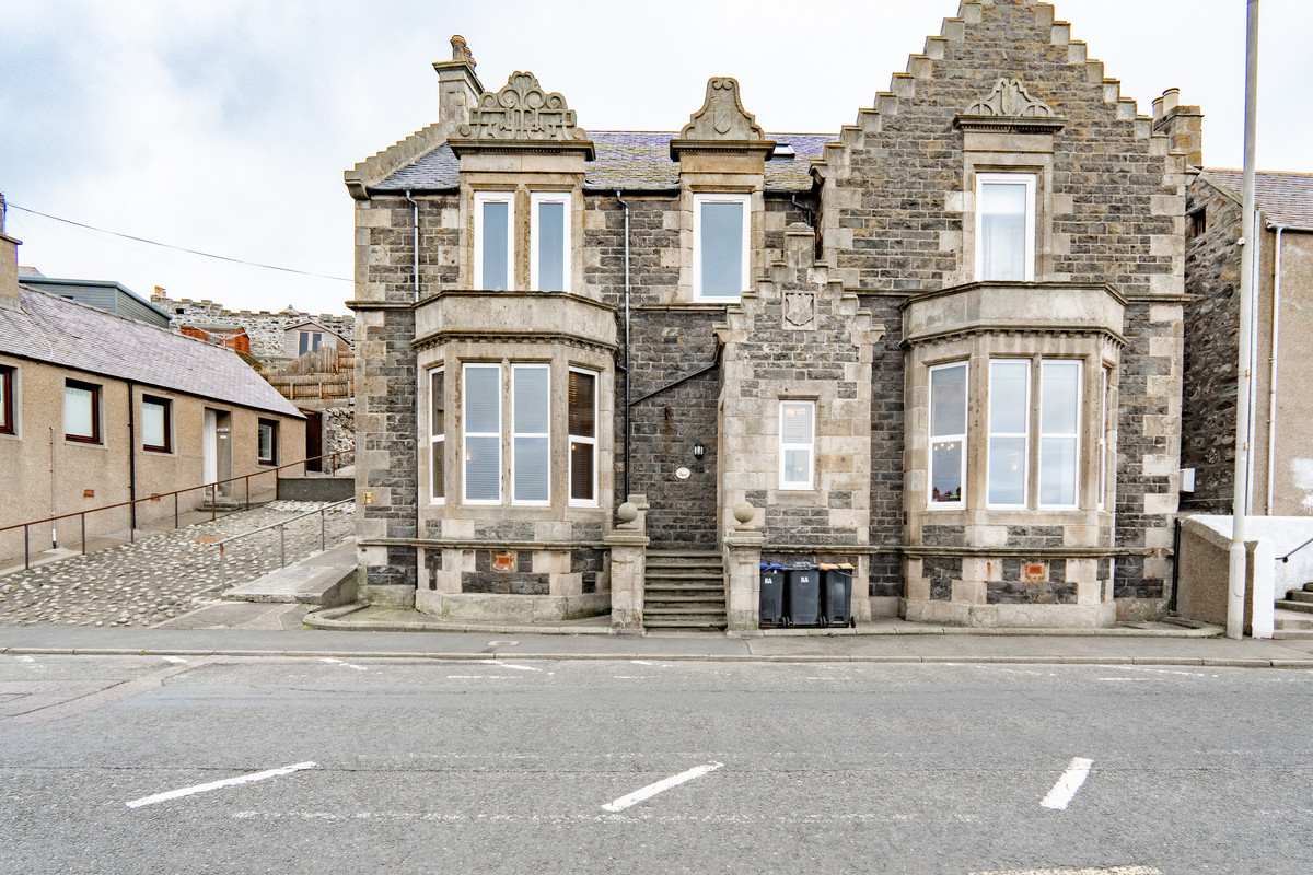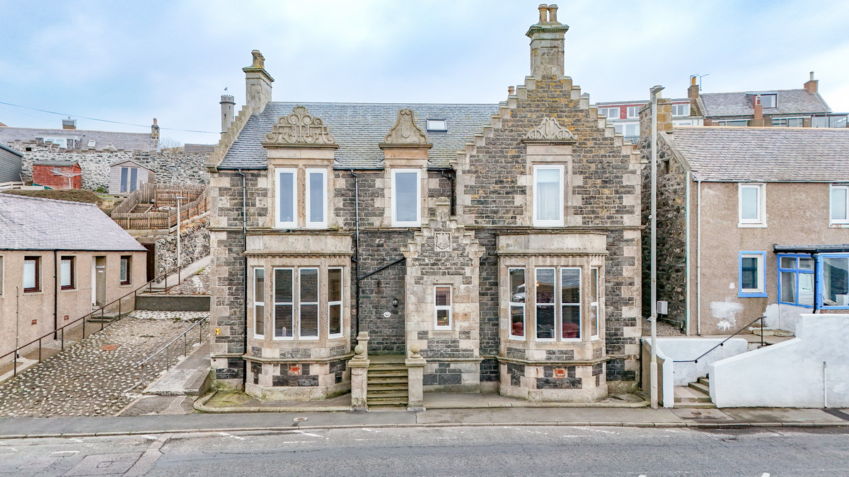 Once serving as part of a historic bank building, 11A Shore Street now stands as a distinctive ground floor flat overlooking Macduff Harbour. The solid stone frontage and intricate architectural detailing reflect craftsmanship from the early 1900s, giving the property a commanding presence along this coastal street. The entrance sits elevated from the pavement, reached by a short flight of stone steps. From here the building opens into spacious, character-filled accommodation that extends across the ground floor and partially into the first.