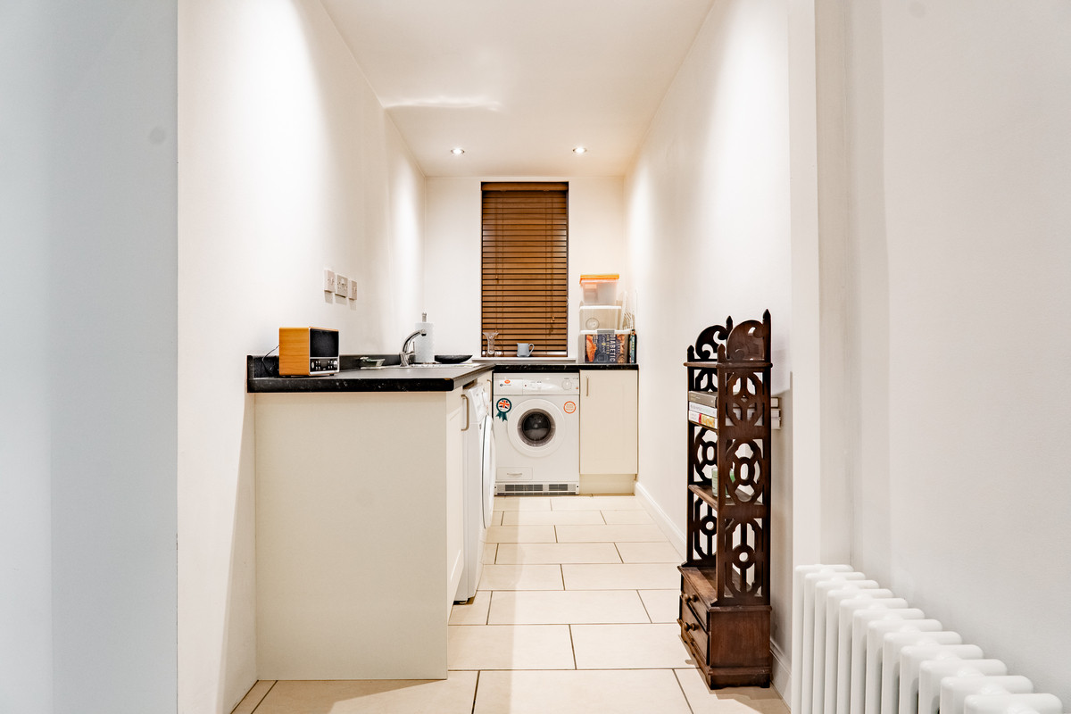 Adjoining the kitchen, the utility room provides another practical workspace, fitted with floor standing cupboards and dark worktops. There’s a stainless steel sink with drainer and a rear facing window, while plumbing and space are provided for laundry appliances. The tiled flooring continues through, while ceiling spotlights add to the clean, modern feel.