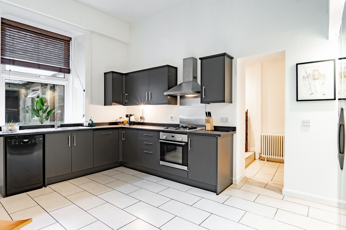 The kitchen is a standout feature of the home, a bright, contemporary space that combines height, scale and modern design. Refitted in recent years, it features sleek black cabinets paired with contrasting white tiled flooring and neutral walls that amplify the sense of light. The layout includes a full range of wall, base and larder units, with extensive worktop space and a stainless steel sink positioned beneath a deep set window. Integrated appliances include a built-in oven with gas hob and matching extractor, while a striking bank of tall gloss fronted cupboards houses an American style fridge freezer.