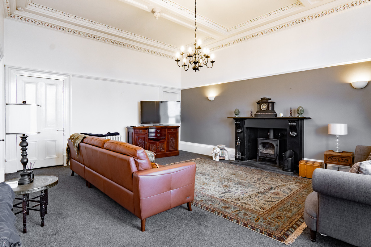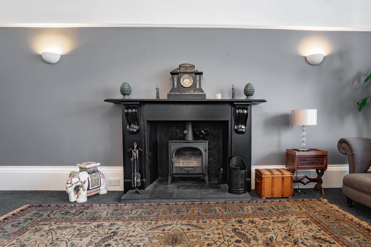 Also accessed from the inner hall, a doorway leads into the lounge, a magnificent room that perfectly showcases the building’s scale and grandeur. High ceilings with intricate decorative cornicing frame the space, while a large bay window floods the room with light and offers a view towards the harbour. The focal point is a striking black fireplace with ornate detailing and a wood-burning stove set against a slate hearth, creating a real presence. A soft grey wall on one side contrasts elegantly with crisp white on the others, giving the room a refined, balanced character. With generous proportions and timeless architectural features, it’s a space that feels both impressive and welcoming.