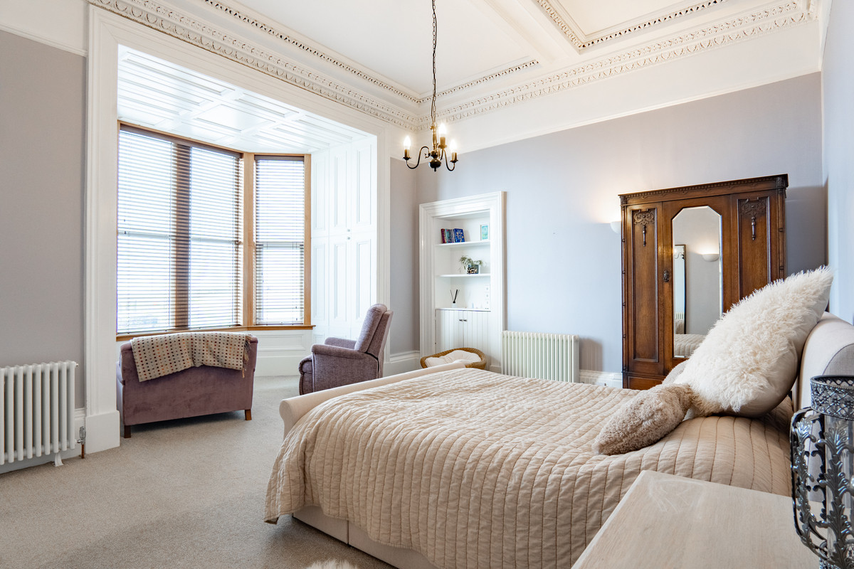 This bedroom is a grand space, enhanced by exceptionally high ceilings and decorative white cornicing with an intricate patterned design. A large bay window dominates the front wall, filling the room with light and offering views across the harbour and out towards the sea. The soft lavender tone of the walls paired with the light grey fitted carpet creates a calm, inviting atmosphere, while traditional style radiators are fitted on either side of the room. There’s space for a full set of bedroom furniture, with a double bed currently positioned at the centre. A small recessed alcove with white shelving and a built-in cupboard adds charm and storage, completing a room that beautifully blends classic architecture with modern comfort.