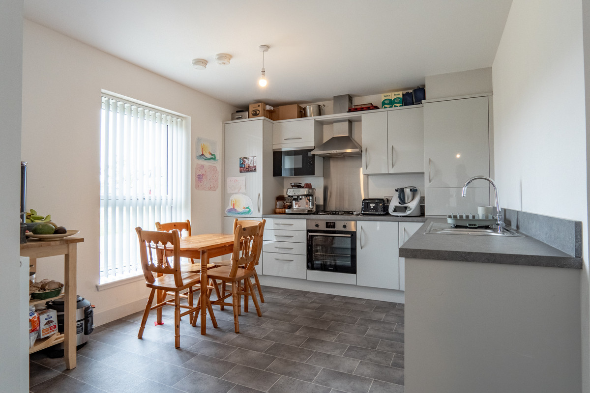 The front door opens into a bright, neutral hallway with crisp white panel-style doors leading to each room. At the heart of the home is the open-plan lounge and kitchen which is a fresh, modern space with clean white walls and a large window that floods the room with plenty of daylight. The lounge area is a good size, offering comforatable space for seating and furnishings while still maintaining a sense of openness and flow.