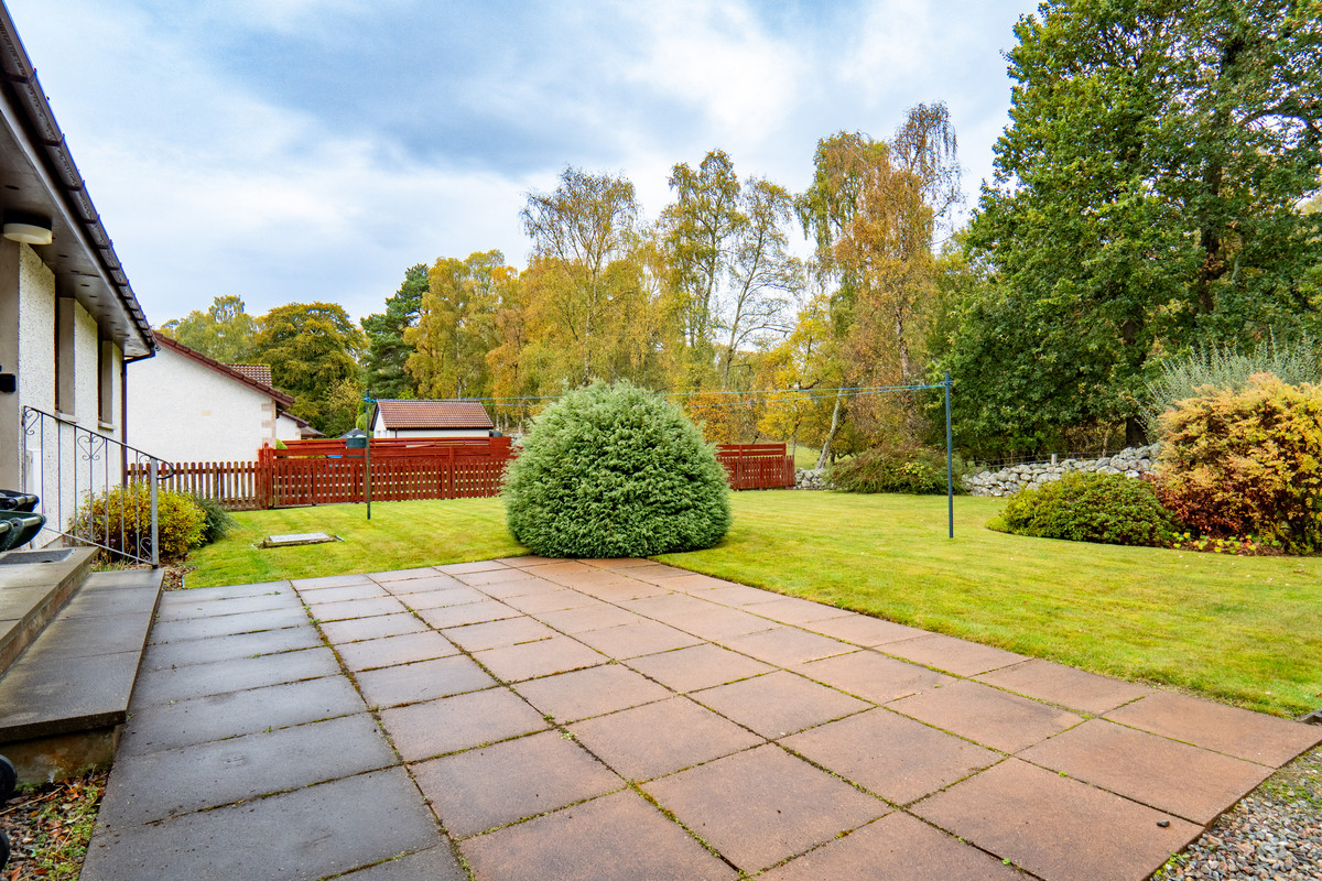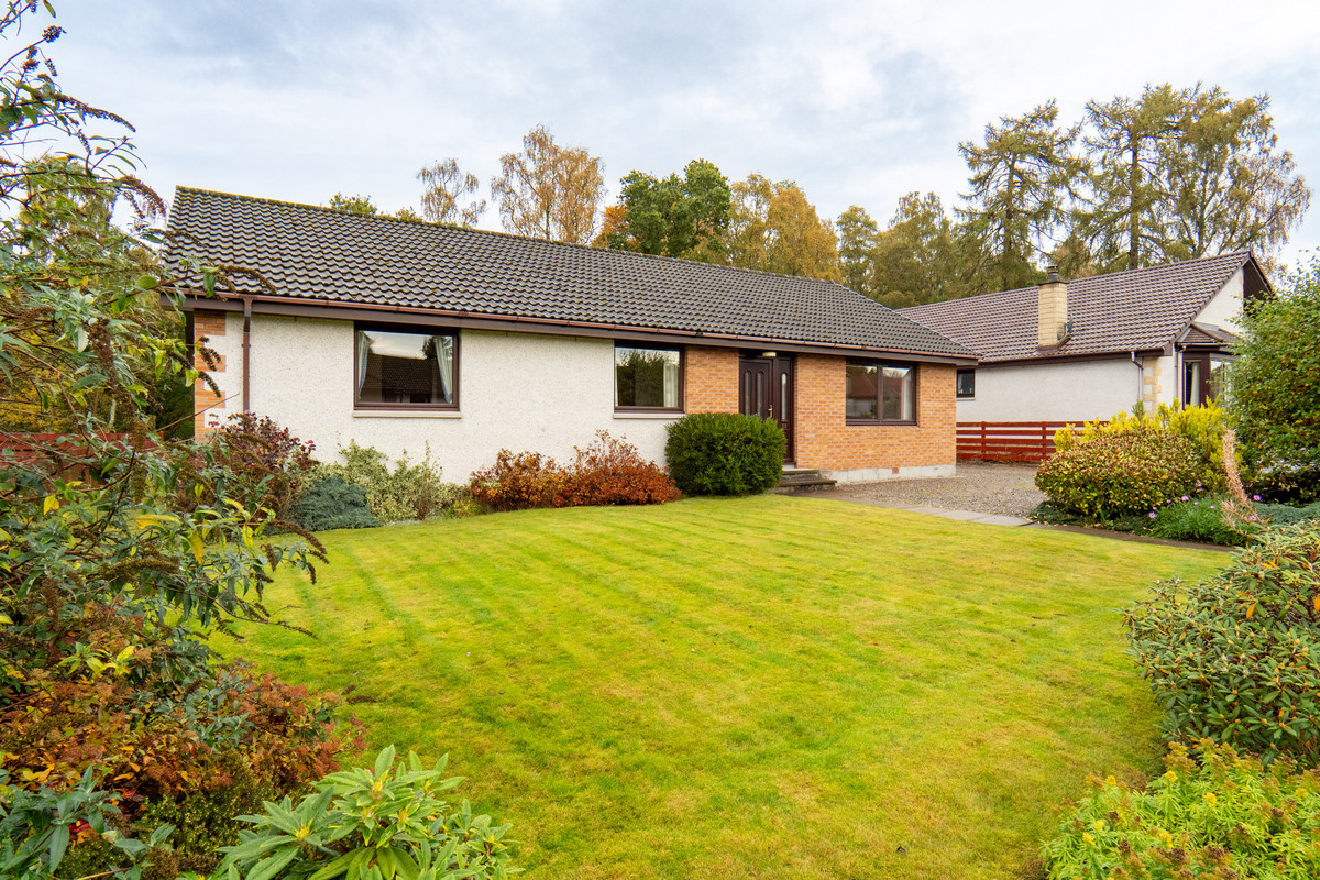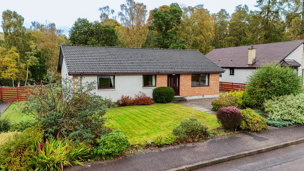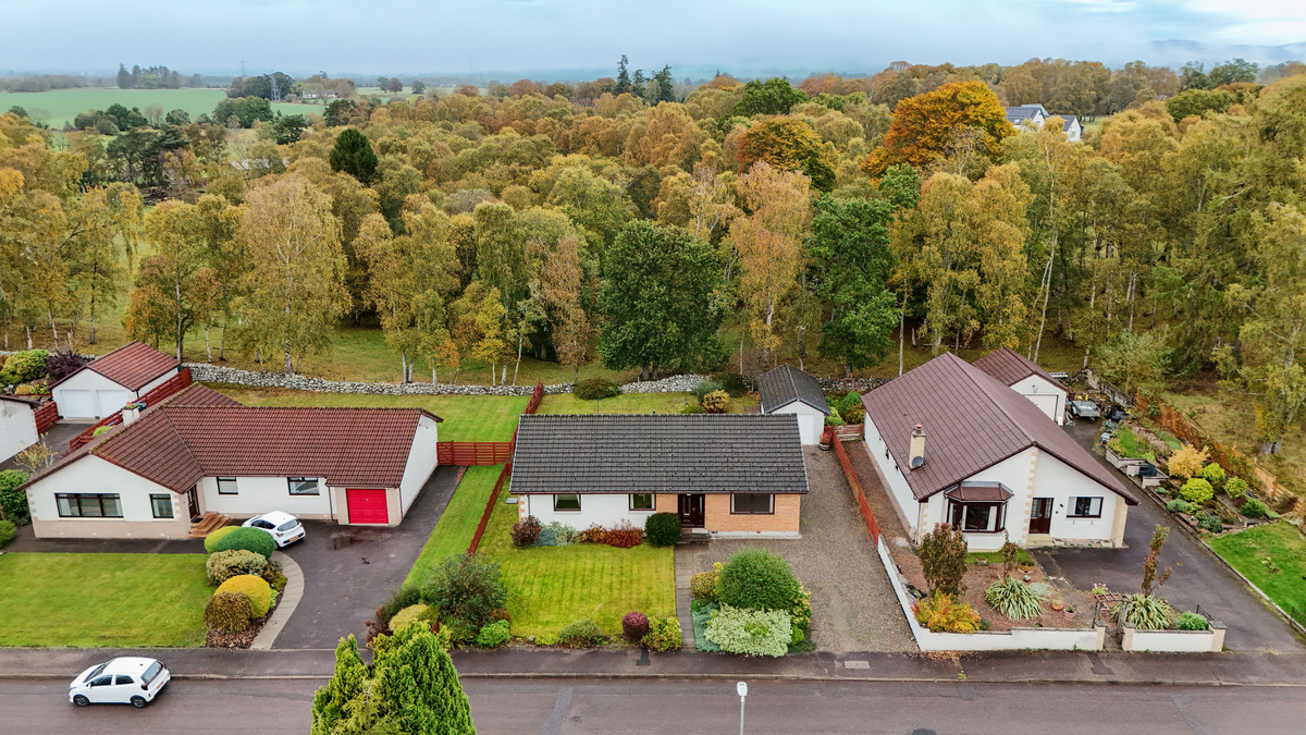Located at the end of a quiet cul-de-sac, this detached bungalow enjoys a leafy setting with woodland behind and a detached garage to the side. Built around 1991, it sits in a well established residential area on the northern edge of Muir of Ord. A tidy front lawn and mature shrubs frame the entrance, while a long gravel driveway leads to the garage and offers plenty of off street parking. The setting feels calm and secluded, with local amenities close by in Muir of Ord and Beauly, with Inverness just 15 miles away by car.