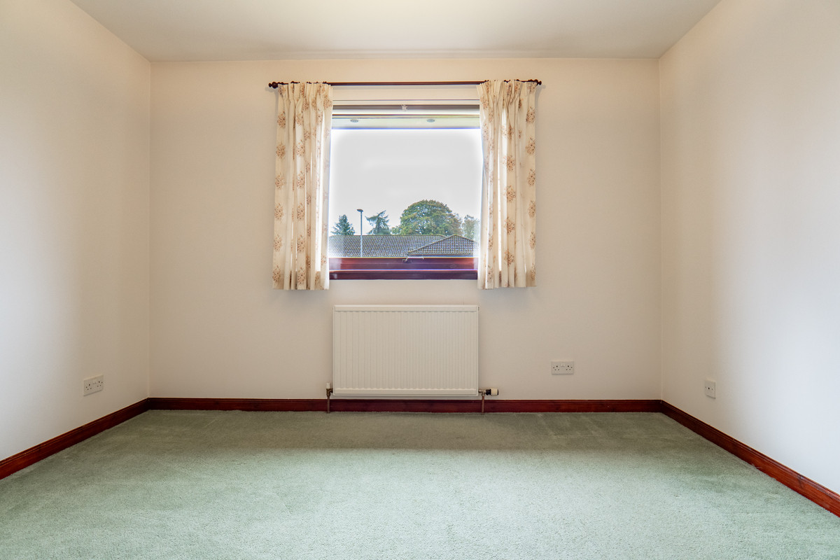 The second bedroom is similarly decorated in neutral tones, with a green carpet that adds a subtle touch of colour. Built-in wardrobes are neatly recessed beside the doorway while the window draws has a radiator beneath to keep the space warm in cooler months.