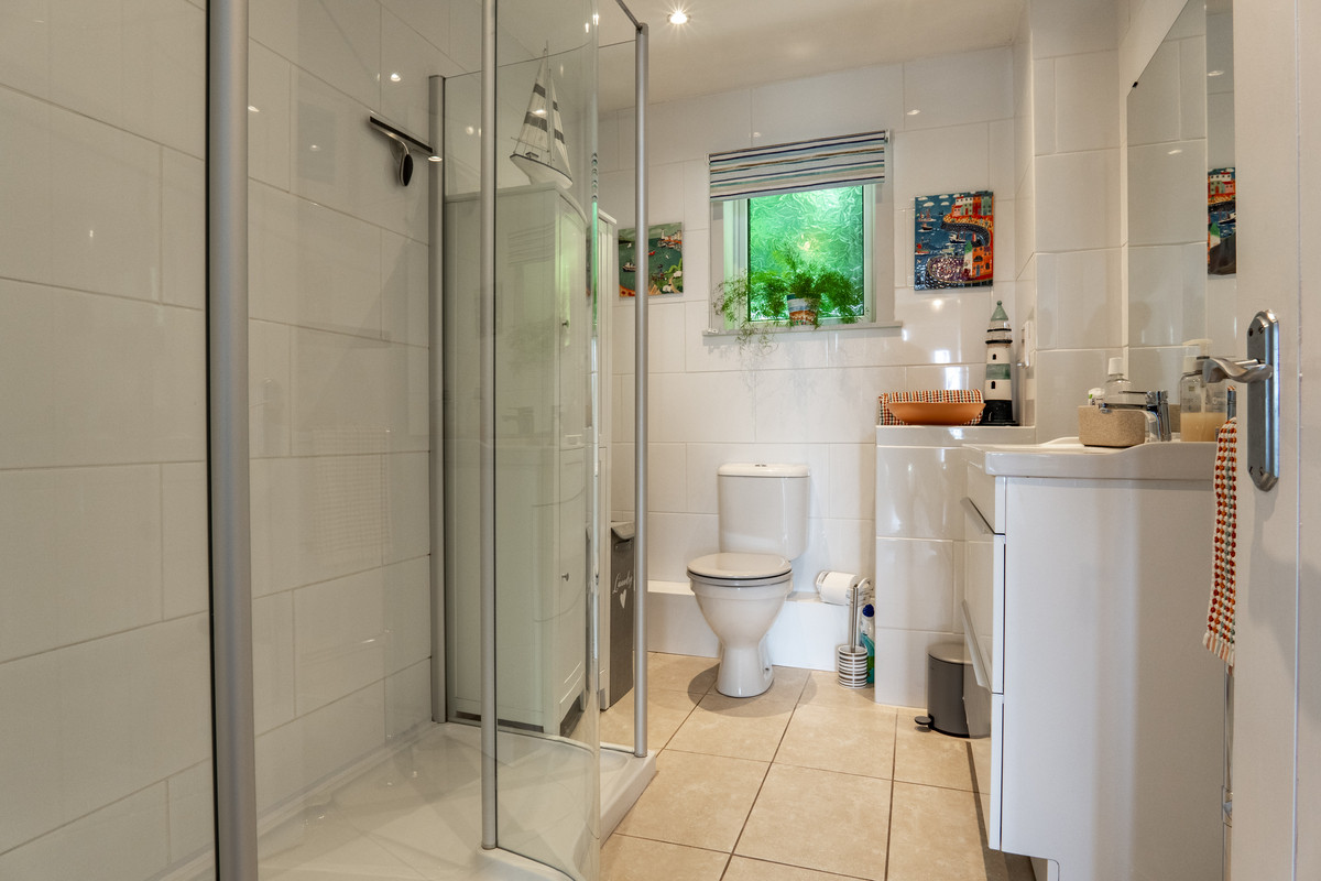 Completing the ground floor is a smart shower room, where white tiled walls, a large mirror and frosted window help maximise the light and airy feel. A mains-fed shower with modern enclosure is joined by a toilet and a basin set into a sleek storage unit, all finished in fresh, neutral tones for a stylish space for all the family.