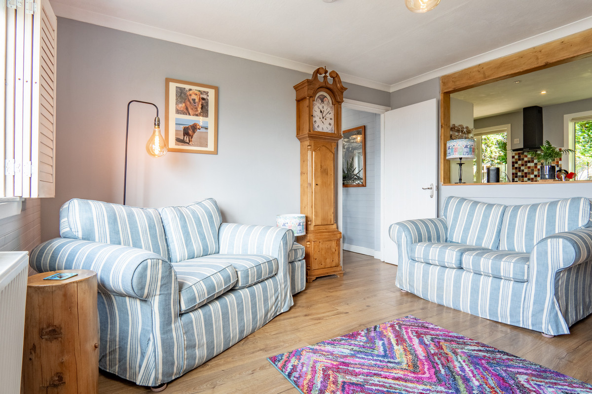 Inside, the home unfolds over two levels, starting with a spacious sitting room at the front of the house. Solid wooden flooring and soft grey walls create a fresh yet cosy backdrop, while the wood-burning stove, set into a modern fireplace, adds both charm and comfort. There’s ample room for a full sofa set and additional furniture, making this a central hub for relaxing or gathering with family.