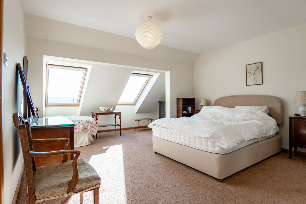 The next bedroom is a interestingly shaped and generously sized space with real character. Its design makes clever use of the roofline, with twin Velux windows set into deep alcoves that add architectural interest. Soft cream walls and warm beige carpet create a restful and airy feel. There’s space for multiple beds or larger furnishings, with fitted wardrobes providing practical storage.