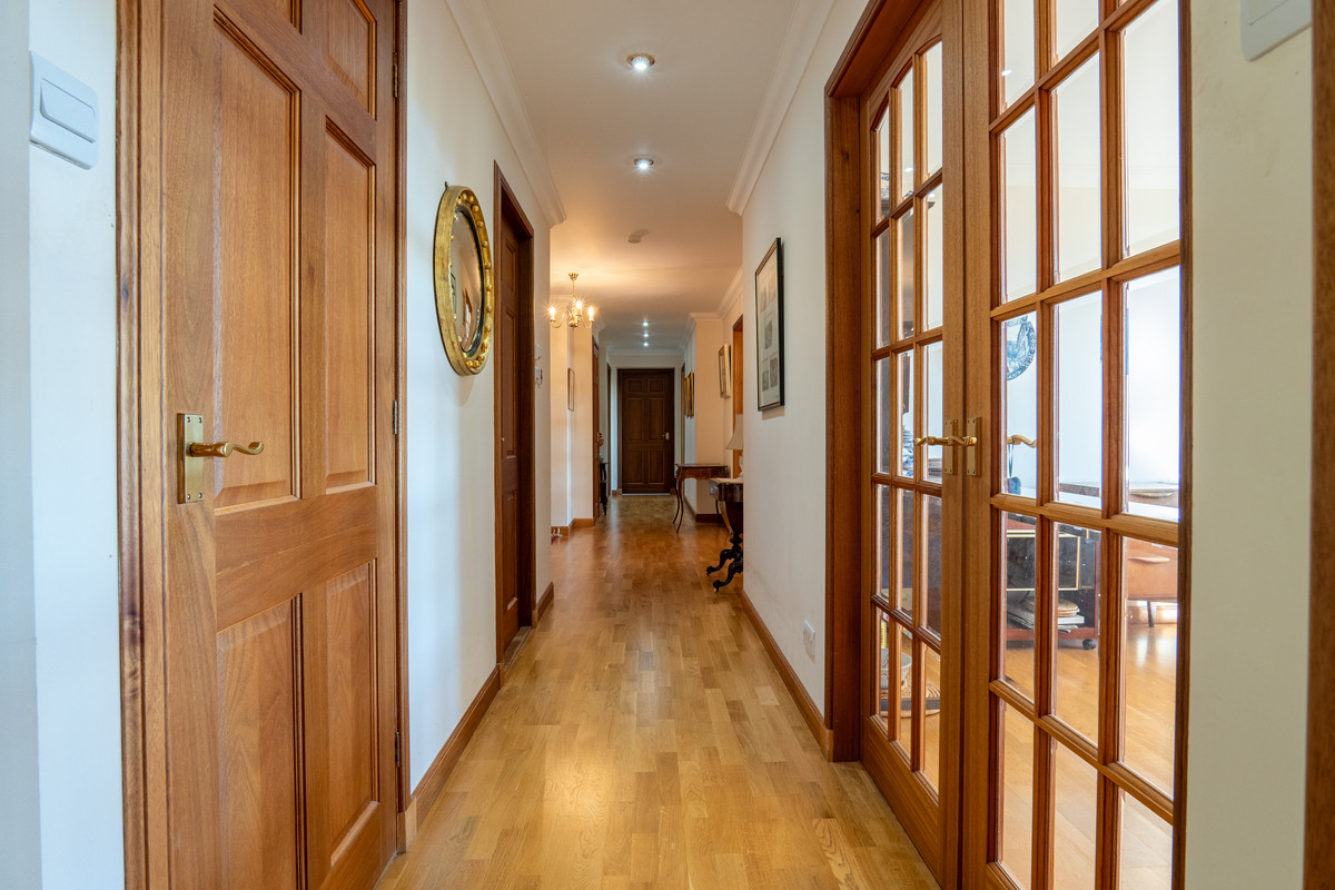 The second bedroom on the ground floor sits nearby and is another spacious, light filled room. Currently arranged as a home office, it could easily accommodate a double bed and additional furniture if required. Fitted wardrobes provide generous storage while the polished wooden flooring adds a sense of continuity with the rest of the home.