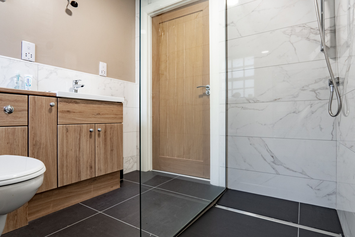The shower room has been finished to an excellent modern standard, featuring large white and grey marble effect wall tiles that give it a bright and contemporary look. A walk-in enclosure houses a rainfall shower with an additional handheld fitting making it a stylish and practical spot. A fitted vanity unit with a rectangular basin provides both storage and counterspace, while chrome fittings and a heated towel rail complete the smart design. A window brings in natural light, enhancing the clean and polished feel of the space.