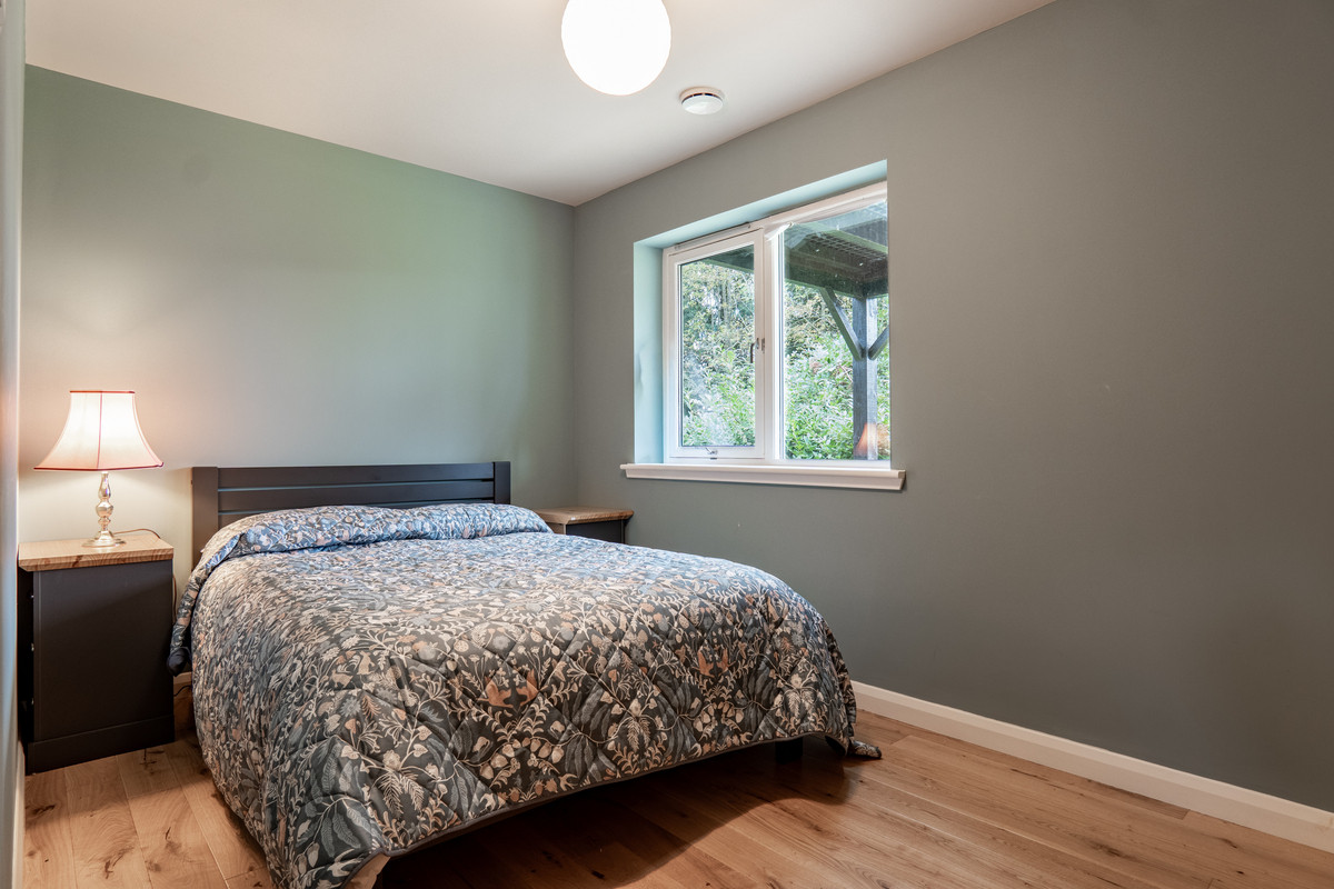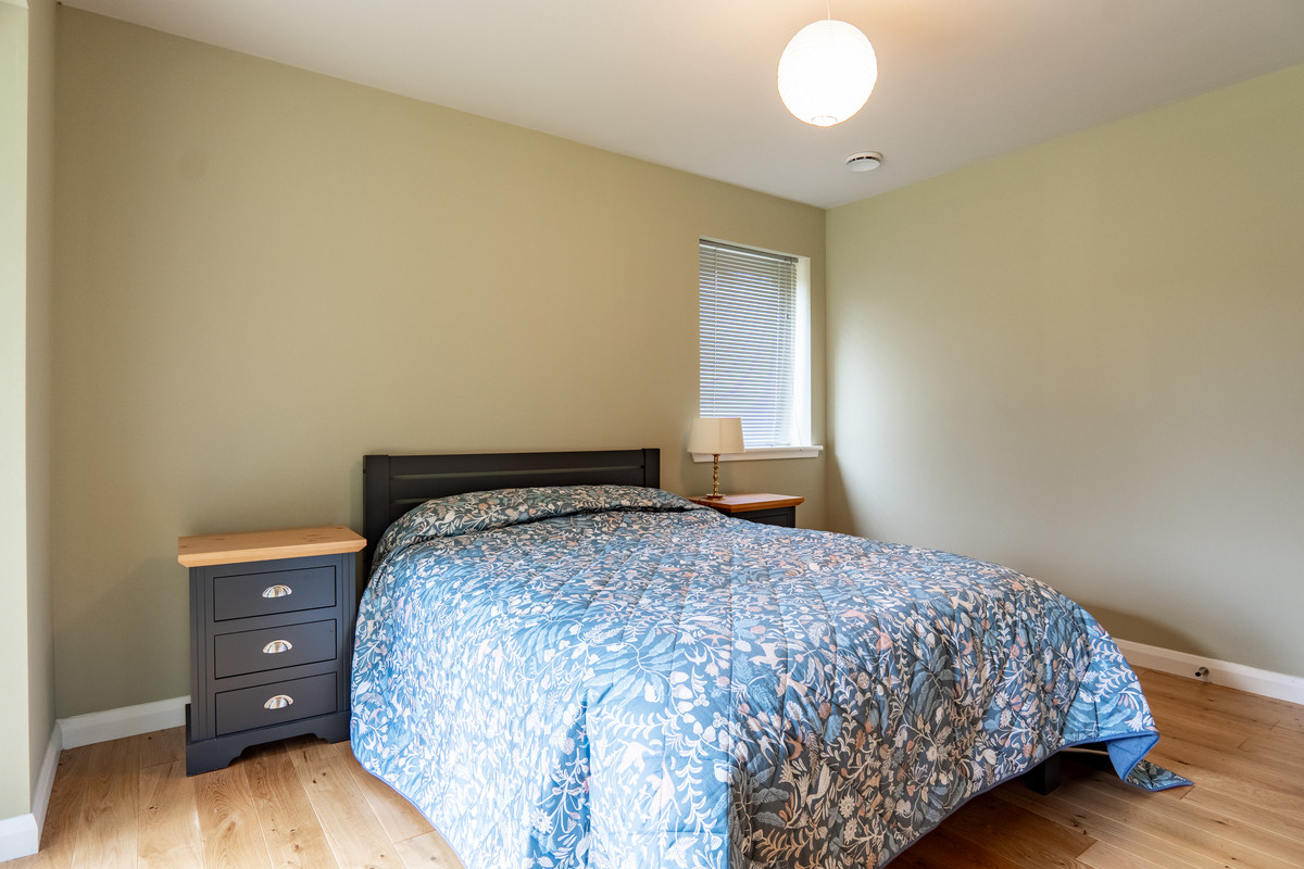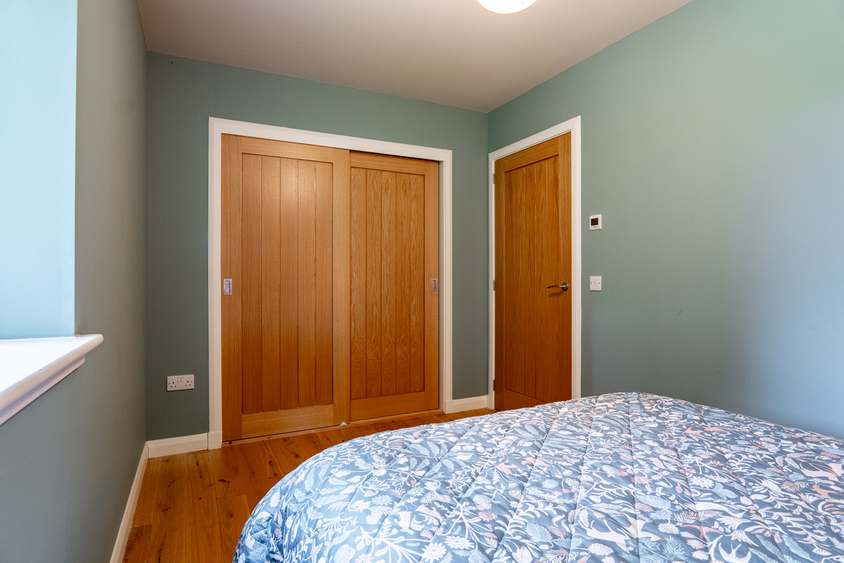 The first bedroom enjoys direct access to the garden through glazed patio doors that bring in plenty of natural light. The room is finished in a soft sage green tone that creates a calm, restful feel, with natural wood detailing adding warmth. A built-in wardrobe with sliding wooden doors provides useful storage while keeping the space uncluttered. The layout comfortably accommodates a double bed and matching furniture, making this an inviting and practical main bedroom.