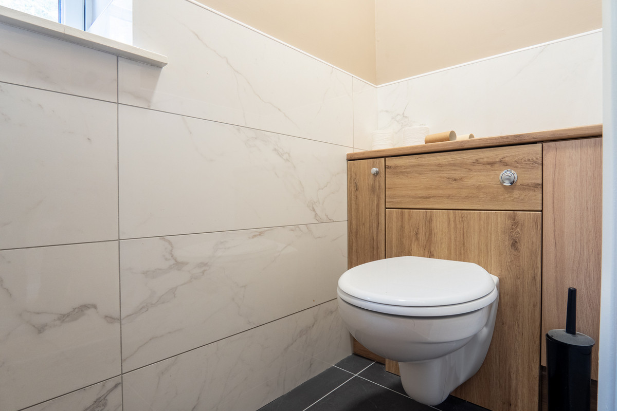 A separate WC sits near the front door, echoing the same high quality finish with marble effect wall tiles and dark floor tiling. A fitted unit with toilet and concealed cistern sits on one wall, while the opposite wall houses a matching vanity unit with inset basin and chrome mixer tap. A window provides natural light and ventilation, keeping the space bright and private.