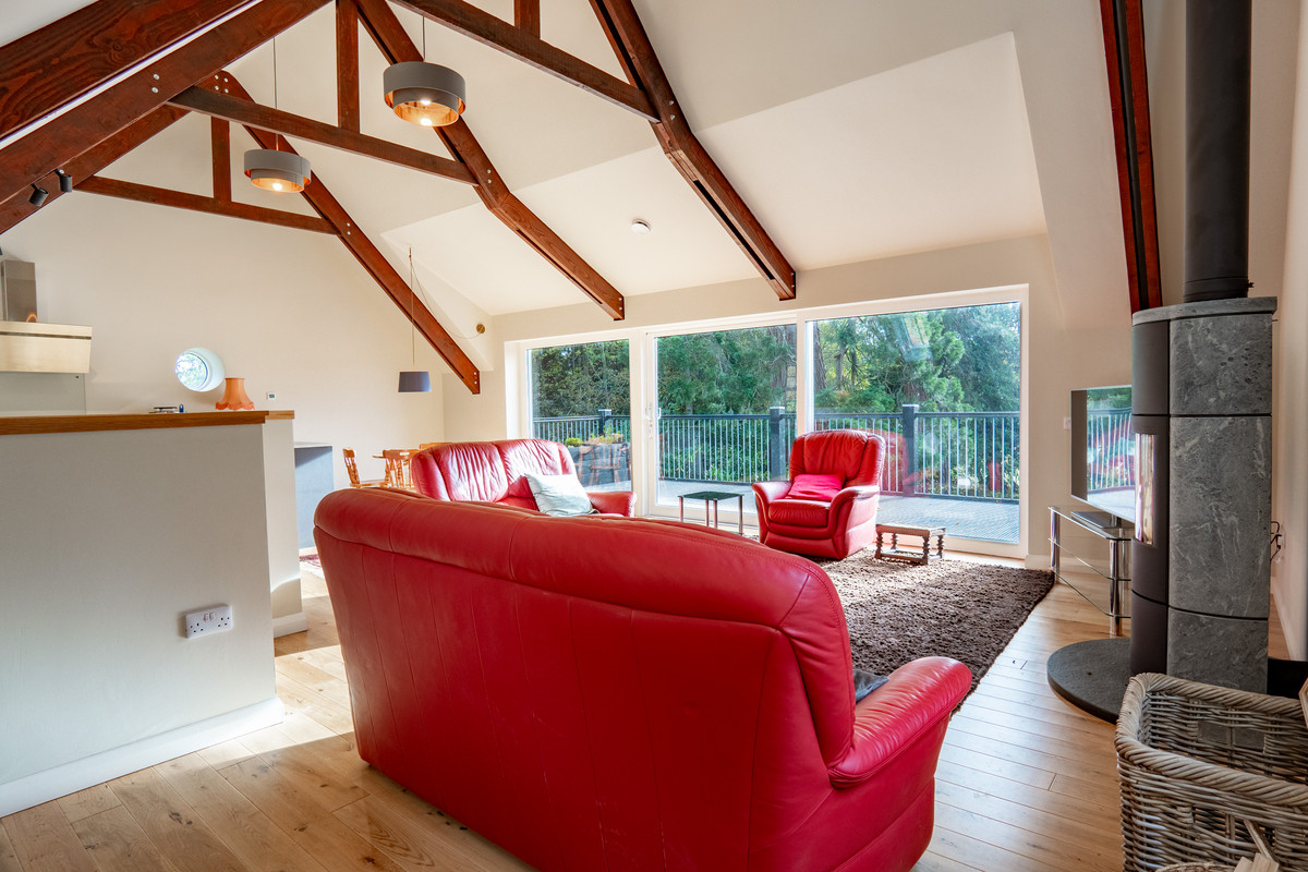 Moving inside, the first floor opens into a bright and beautifully designed open plan living, dining and kitchen area that makes the most of the home’s woodland setting. The entire space sits beneath a vaulted ceiling, where dark exposed timber beams contrast elegantly against soft cream walls and the natural tones of the wooden floor. Full height glazing along one side floods the room with light while sliding doors open directly onto the balcony, extending the living space outdoors.
