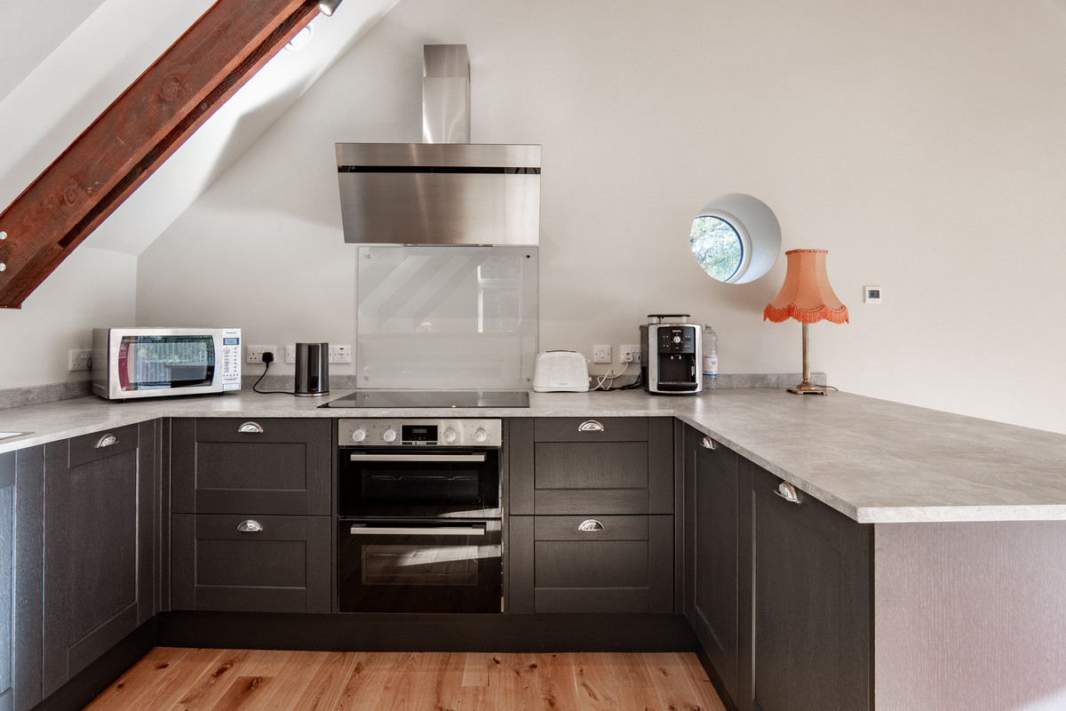 The kitchen is fitted with contemporary dark grey shaker style cabinets with chrome cup handles adding a subtle touch of shine. Pale stone effect worktops provide generous preparation space while a glass splashback sits neatly behind the electric hob that’s mounted above a double oven. The stainless steel sink is positioned neatly below a window for you to enjoy views of the surrounding countryside. The adjoining dining space offers room for a table and chairs, perfectly positioned to enjoy the views, while the lounge area is arranged around a modern cylindrical wood burning stove that provides both warmth and a striking focal point. Together, these elements create a relaxed, open space that’s ideal for everyday living or entertaining.