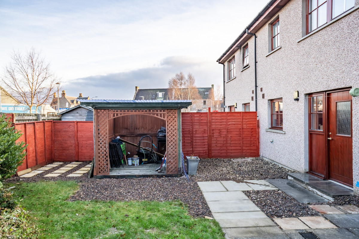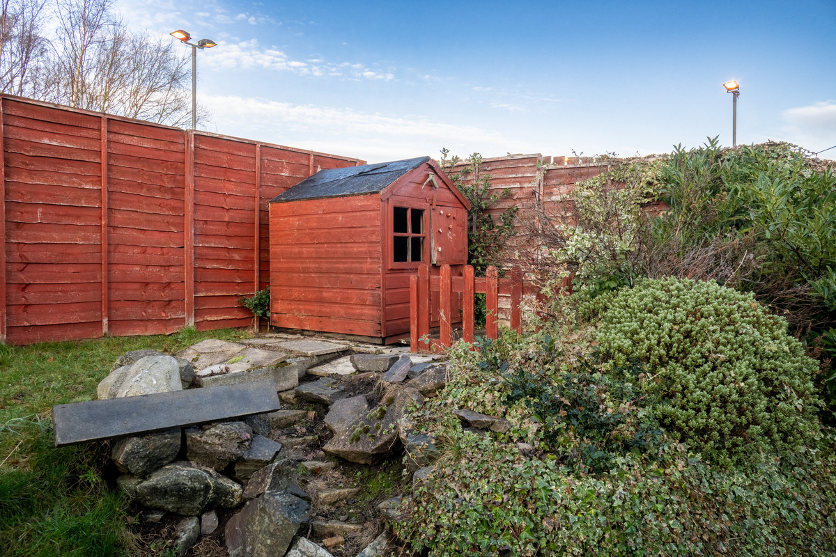 The outdoor spaces include a private, fully fenced garden with a mix of lawn, stone chips and paved areas. A timber shed provides additional storage space and the tarmac driveway to the front ensures convenient off-street parking.