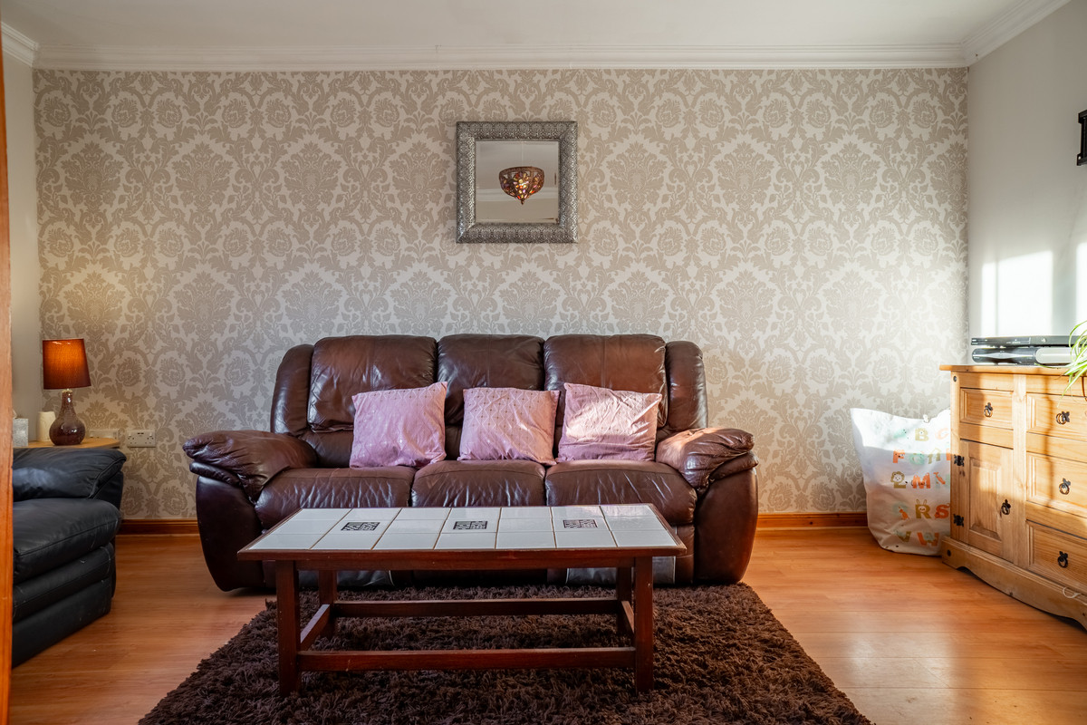 The home opens into a bright and welcoming hallway with practical wood laminate flooring and a staircase which benefits from an under-stair storage cupboard. From here, you’ll find a cosy living room, where a large window provides views to the front and fills the room with natural light. The neutral walls create a calm and versatile backdrop, while a beautifully patterned floral feature wall adds a touch of elegance and character.
