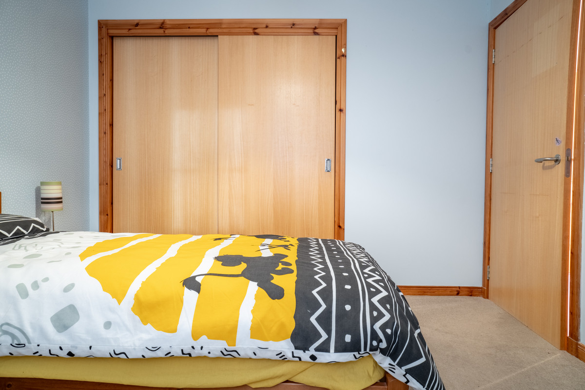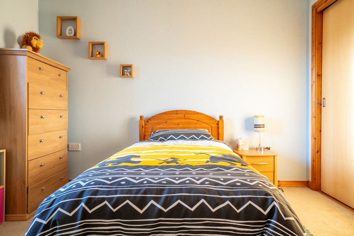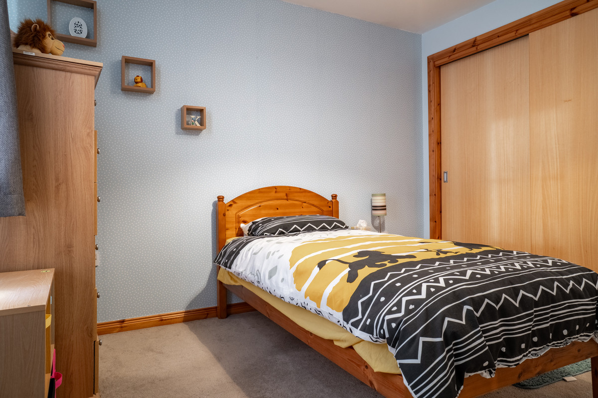 Upstairs, the carpeted staircase leads to two good-proportioned bedrooms, each featuring neutral décor and built-in wardrobes. The primary bedroom offers plenty of space for a double bed, while the second bedroom, currently styled as a child’s room, also accommodates versatile layouts. The family bathroom is a bright and stylish retreat, perfectly balancing functionality with modern design. It features a crisp white suite, including a spacious bath with a powerful electric shower overhead, providing versatility for both quick morning routines and leisurely soaks. The bath area is beautifully finished with a blend of light tiles accented by a striking row of contrasting black tiles, adding a subtle touch of sophistication to the space.